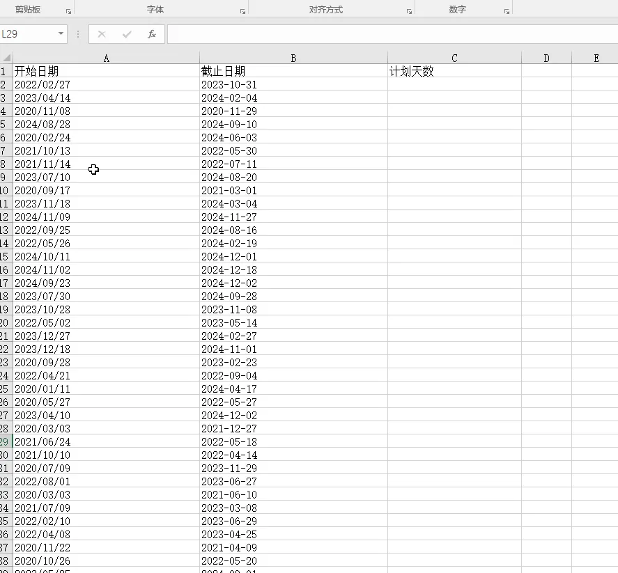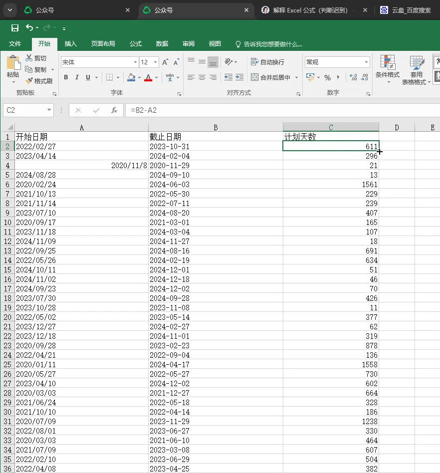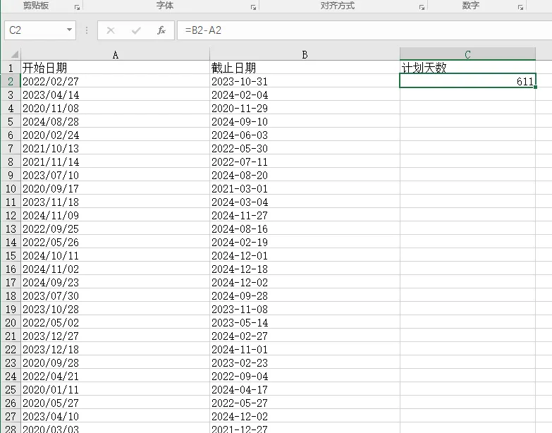 1. 有如下数据,现在要计算开始日期到截止日期的天数