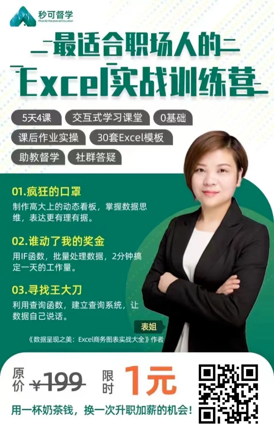 前段时间,接到朋友的电话,她告诉我:前段时间部门主管的位置空缺,她想争取一把,不料,却被实习生当头棒喝。审核投标信息单录制凭证时,她打开七八个窗口,不停录入信息,一整个下午都在填写重复的项目清单。汇总各个项目的预算金额以及人员工资支出明细时,她一栏一栏复制粘贴。没想到,第二天开月度总结会,部门实习生的各项工作指标完成得都比朋友的好:不仅数据全面,对比清晰,还有图表作为直观的展示。看到实习生的汇报,朋友像个泄了气的皮球:“在公司待了3年,现在却不如一个实习生,你说这叫什么事啊?”以旁观者的角度,我建议她主动去请教一下实习生工作的“秘诀”。没想到,实习生告诉她,自己工作上很多问题都是用 Excel 来处理的,又快又方便,还能降低数据的出错率——Excel???没想到是自己以前瞧不起的Excel。“是呀,Excel 不仅是一个处理数据的工具,还能帮自己建立数据思维!“用Vlookup函数,可以快速核对数据,并且在多个表格之间快速导入数据,简单点几下,就能让它们更新数据,大大节省时间~用Excel做出的数据透视表,一张表就能体现多个表、多个来源的信息,不仅简单、方便,更能够轻松展现你的高水平业务能力。用Excel做动态数据看板,形成多种可视化图表,让数据一目了然,更容易从数据中发现问题,找到业务突破口。而且,大公司都是用各种数据看板推进业务,尤其是涉及到销售、财务、资源盘点、人员调动等等业务。一个数据看板,顶得上十几张表格!连周报、月报,她也用Excel实现自动更新,每次更新几个数字就OK,超方便~如果你是领导,看到这样的图表,是不是觉得这样的员工很给力?二来数据分析能力强,能把复杂问题简化成容易理解的图表,抓住问题的重点和关键。朋友顿时对实习生改观了,也意识到:职场只看能力,不看资历。你不进步,就等着被别人超越,这就是事实。但站在长远角度上看,如果你永远只顾着自己忙,不懂得借助工具帮自己提升时间价值,那就意味着,你永远无法突破现在的瓶颈。毕竟,“对于很多工程师来说,学会万能的Excel,足够搞定80%的问题!”去报班:不仅浪费很多时间精力,还花了一大笔冤枉钱[图片]找视频:几集枯燥无趣的课程下来,脑子里一片浆糊,还是不懂怎么实操运用[图片]今天给大家推荐秒可职场《4天Excel速学课》,报名超火爆,已经有超百万学员!课程总结了几百位一线大厂精英的Excel技术精华,从质量工程师常用功能出发,帮你提高工作效率,真正成为时下抢手的数据分析人才。课程提炼出精华、核心的知识和技能,帮助你用更省力的方式抵达学习目标。教你Excel的底层逻辑、思考方式和设计规则,帮助你逐步建立数据思维,在此基础上,助你升职加薪。