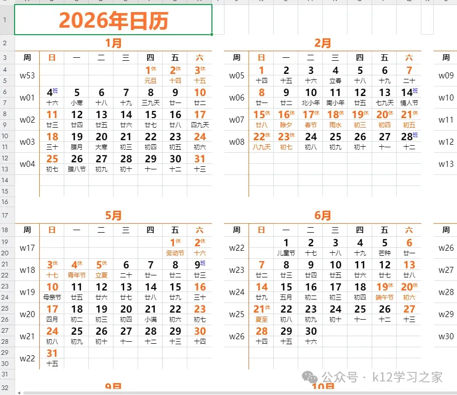 日历表2026年日历中文版纵向排版周一开始带周数带农历带节假日调休安排xlsx