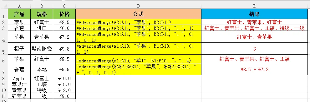 =AdvancedMerge(A2:A11, "苹果", B2:B11, "、", 1)结果:红富士、青苹果、红富士、1L装、特级匹配了"苹果"、"苹果汁"、"青苹果"