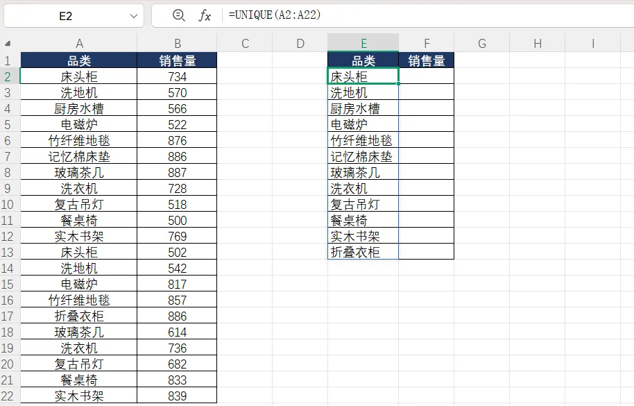 去除重复值,可以直接输入公式=UNIQUE(A2:A22),按回车即可删除重复值。