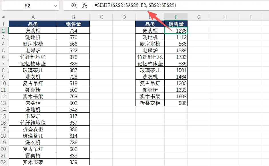 这时想求和可以直接用SUMIF函数来求,输入公式=SUMIF($A$2:$A$22,E2,$B$2:$B$22)获取结果。