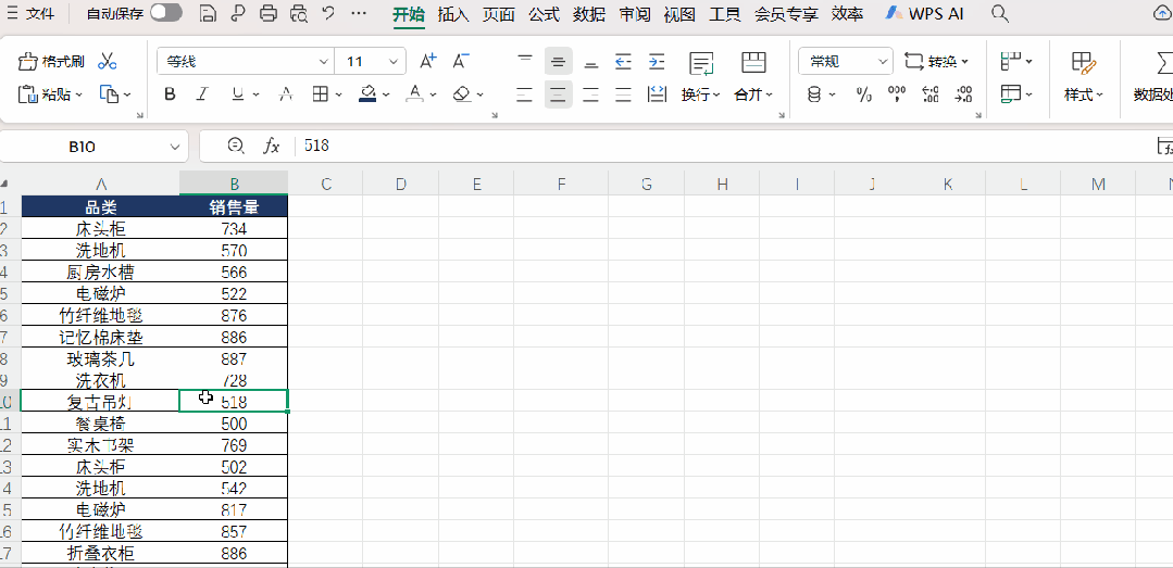 选中区域,点击插入——数据透视表,在打开的界面中,将品类放在行上,将销售量放在数值上即可。