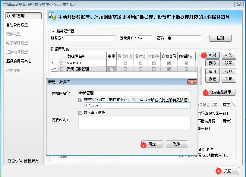 如果有一天,我们又需要建一个独立的会员管理软件,那么,我们可以再新增一个数据库文件,然后把“主数据库”改为这个会员管理,Myexcel登录后,就会默认打开这个会员管理。