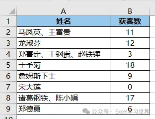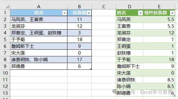 下图 1 是一个非标的数据表,姓名列有多个姓名的,表示几个人共同协作获得 B 列的业绩,因此要将 B 列的获客数平均分给同一单元格内的每个人。