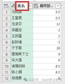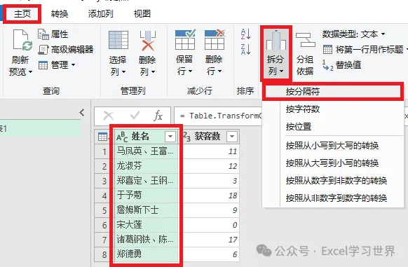 3. 选中“姓名”列 --> 选择菜单栏的“主页”-->“拆分列”-->“按分隔符”