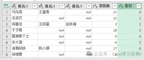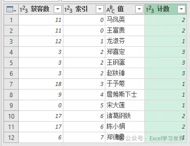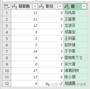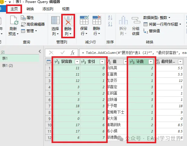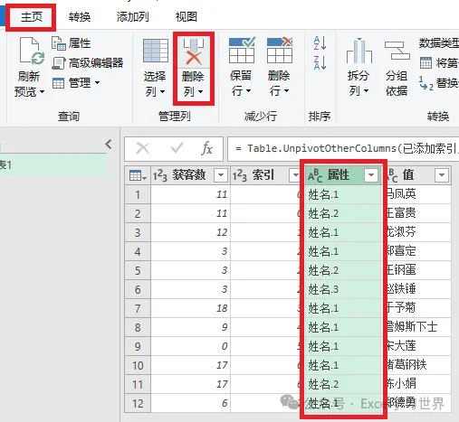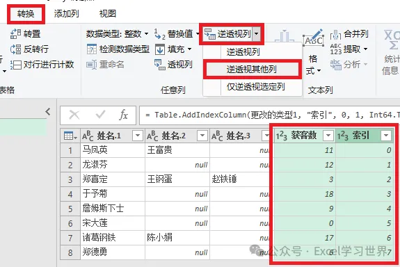 6. 同时选中“获客数”和“索引”列 --> 选择菜单栏的“转换”-->“逆透视列”-->“逆透视其他列”