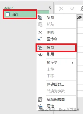 8. 在左侧的“查询”区域选中“表1”--> 右键单击 --> 在弹出的菜单中选择“复制”