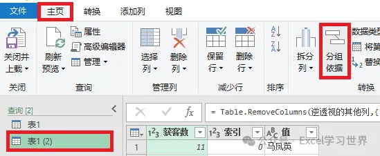 9. 选中“查询”区域中的“表1 (2)”--> 选择菜单栏的“主页”-->“分组依据”