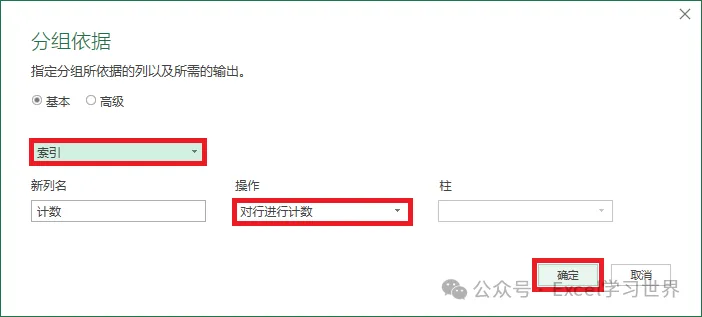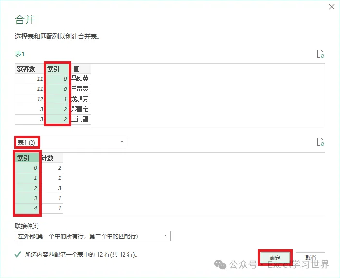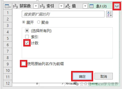 13. 点开“表1 (2)”旁边的扩展钮 --> 仅勾选“计数”--> 取消勾选“使用原始列名作为前缀”--> 点击“确定”