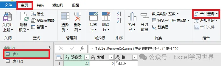 11. 选中“表1”--> 选择菜单栏的“主页”-->“合并查询”