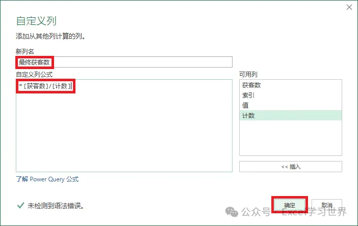 15. 在弹出的对话框中将列名设置为“最终获客数”--> 在公式区域输入以下公式 --> 点击“确定”: