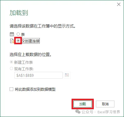 19. 在弹出的对话框中选择“仅创建连接”--> 点击“加载”