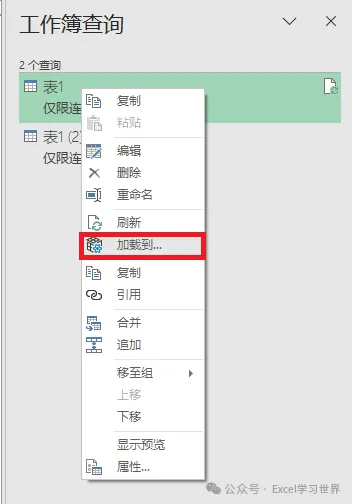20. 在右侧的“工作簿查询”区域选中“表1”--> 右键单击 --> 在弹出的菜单中选择“加载到”