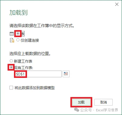 21. 在弹出的对话框中选择“表”--> 选择“现有工作表”及所需上传至的位置 --> 点击“加载”