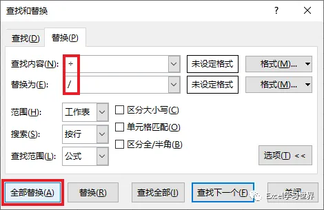 3. 将“查找和替换”对话框中的内容替换如下 --> 点击“全部替换”: