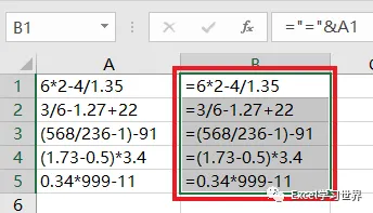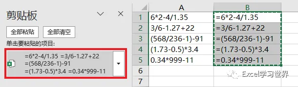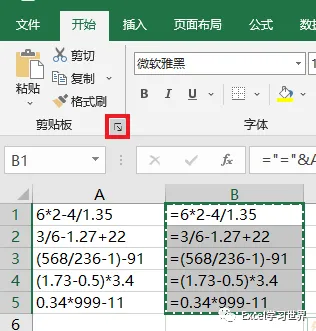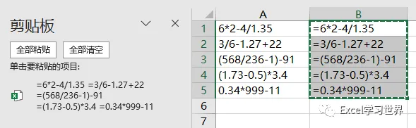B 列就计算出了公式结果。这是因为“剪贴板”有一个很重要的特性,就是所见即所得,它把文本公式变成了真正的公式,从而计算出结果。
