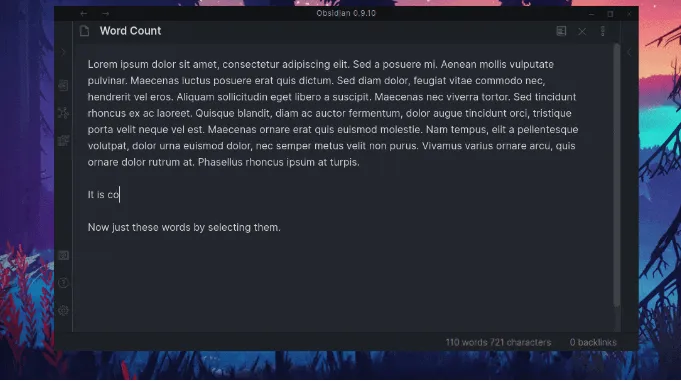 先说它和自带字数统计最大的区别: 平时不选中文本时,它的表现和官方 Word Count 差不多,乖乖告诉你当前文件多少字、多少字符、多少句子。关键在于一旦你选中一段文本,插件就立刻只统计选中部分。 这在几个场景下特别好用: