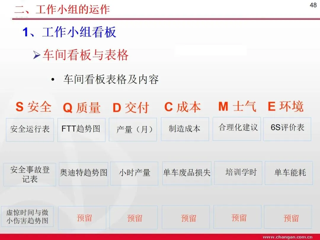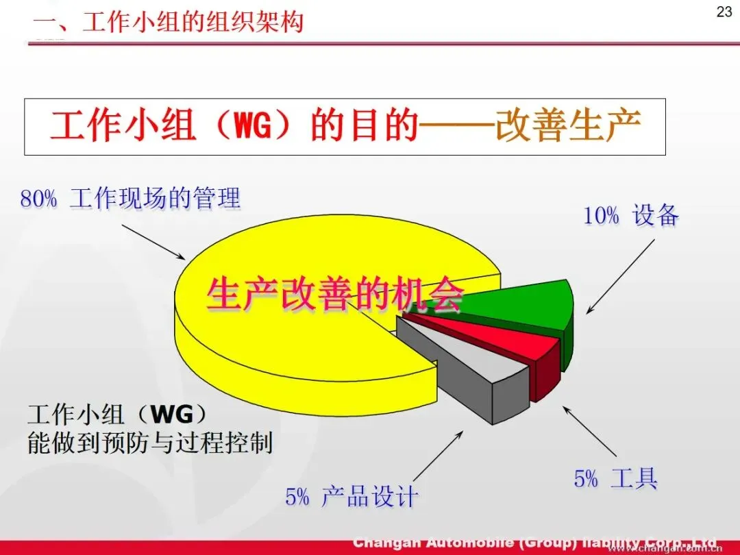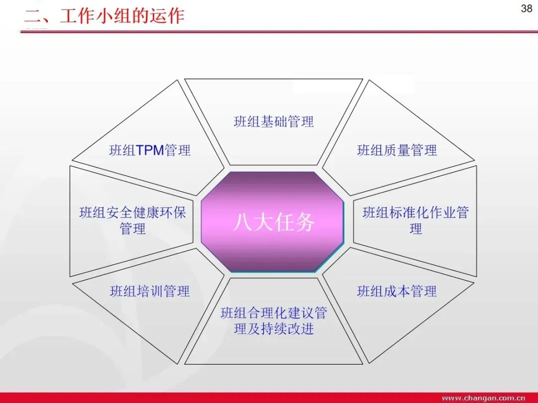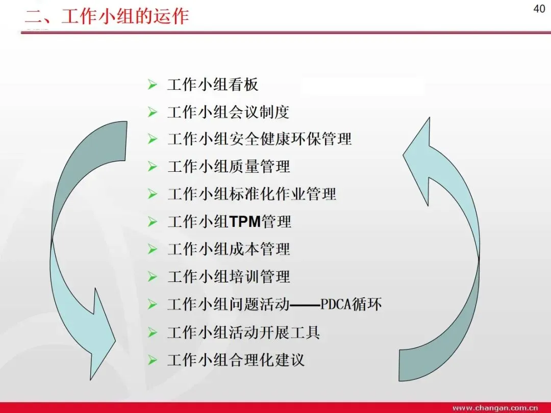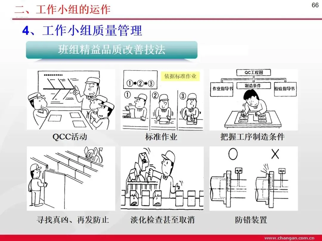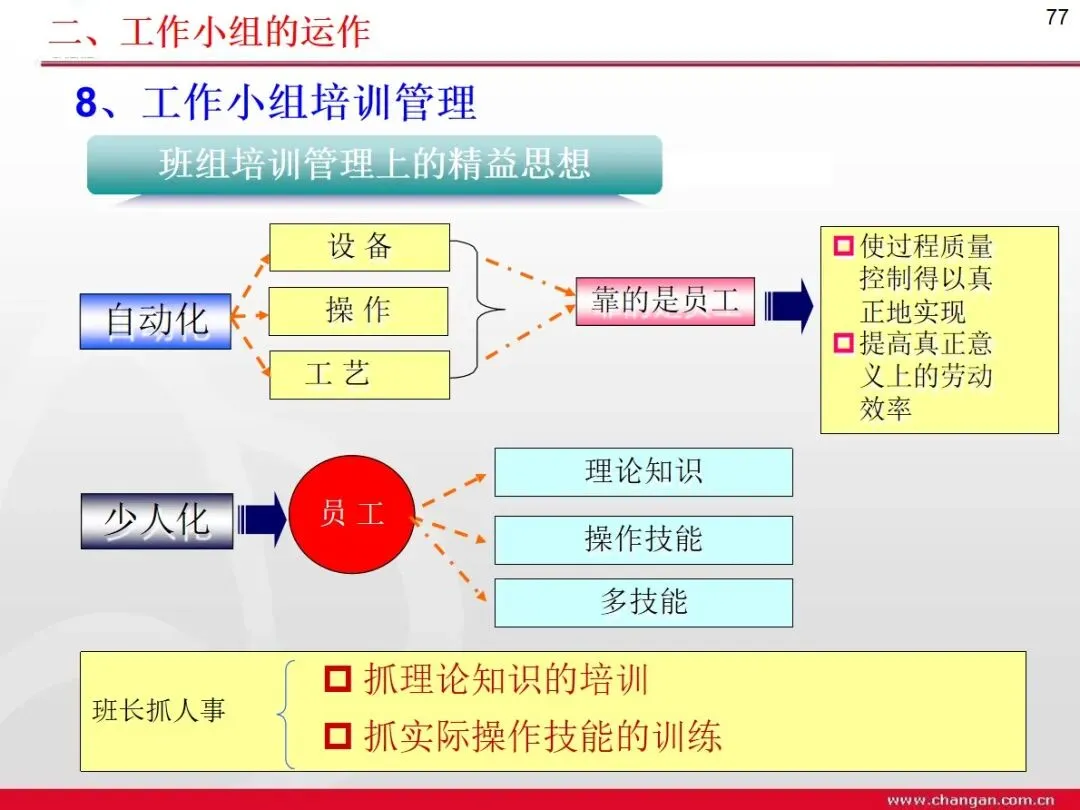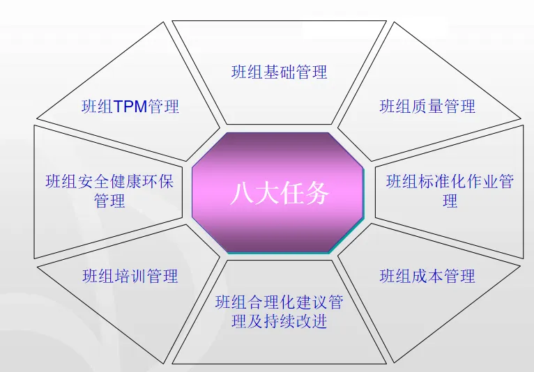 培训的核心是班组作业。工作小组人数以8~20个人为宜,并明确组长,工会组长,质量管理人员,安全管理人员等岗位责任,以“以人为本”和“生产改进”为核心,落实“基础管理”、“标准化操作”、“安全环保”、“质量控制”等8项工作任务。通过工作团队看板将政策与业绩数据可视化,每周约30分钟的团队会议进行双向交流;采用PDCA循环和质量管理七大方法来解决问题,通过提出合理化的改进意见来激励员工进行改进。