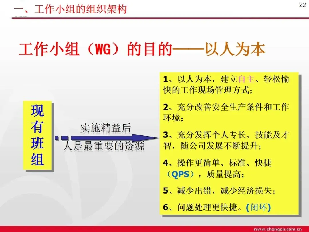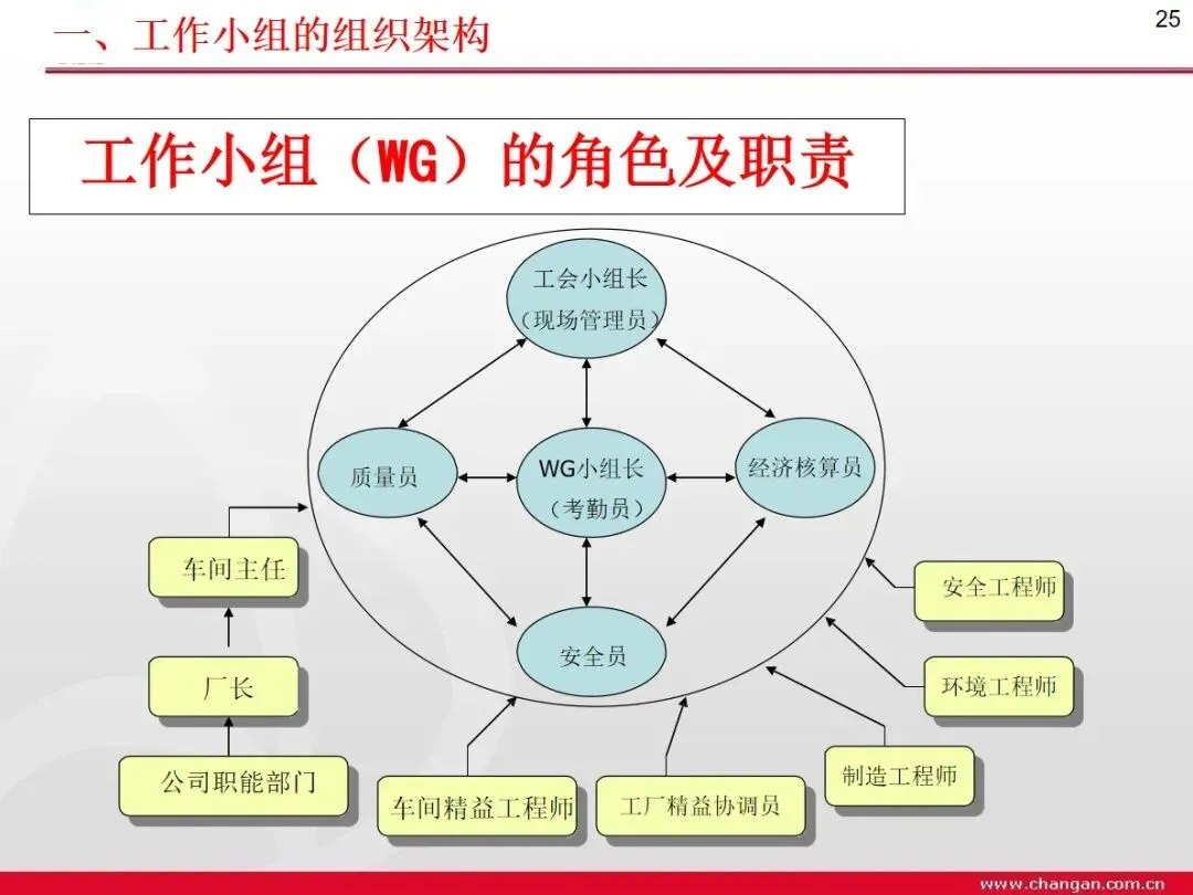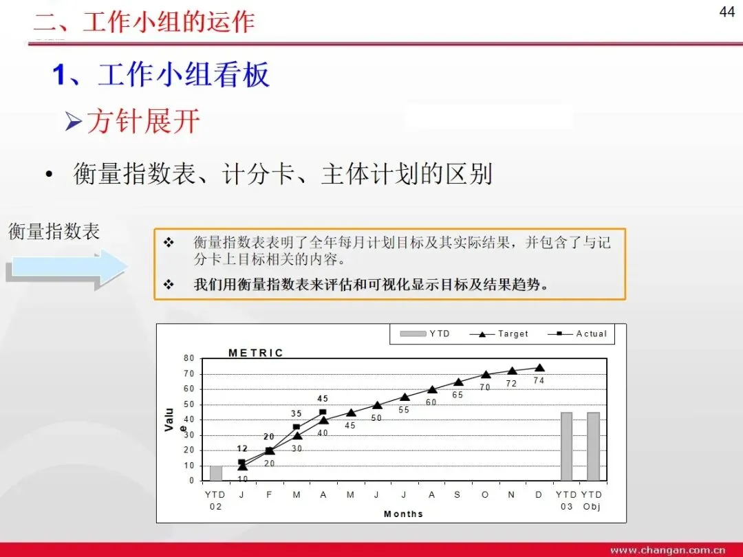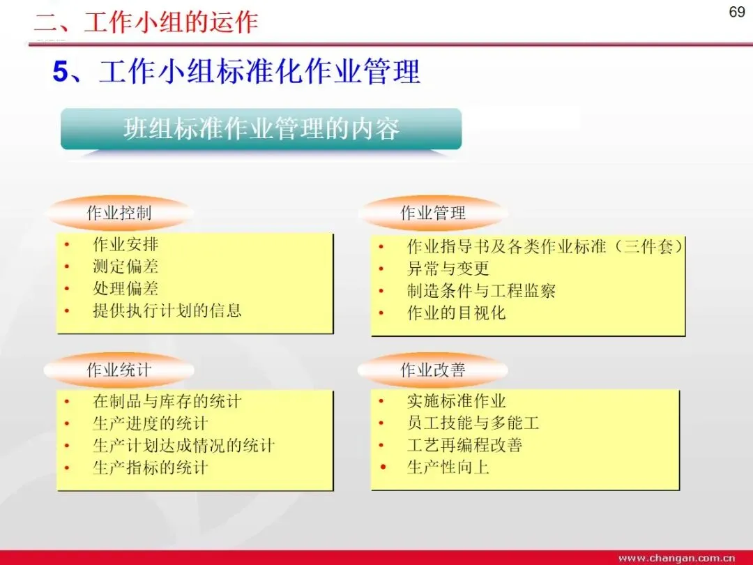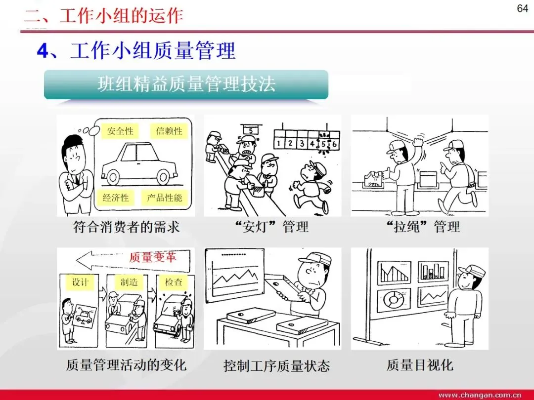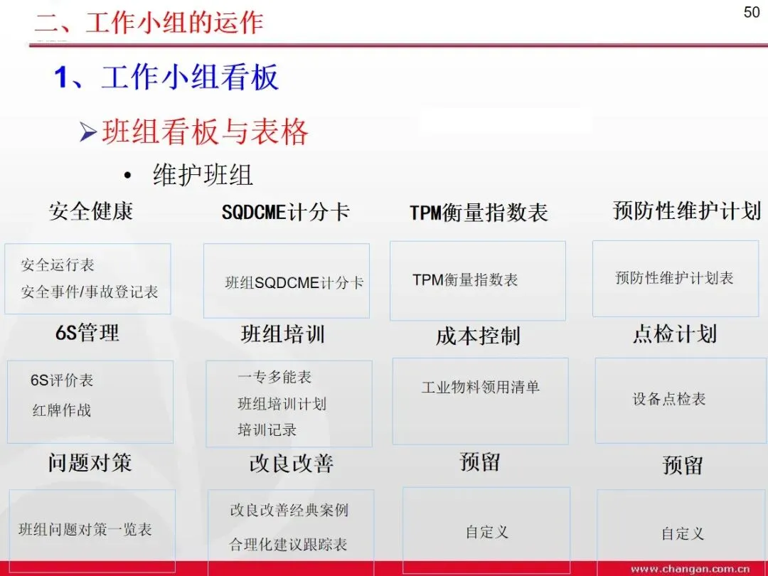 培训的核心是班组作业。工作小组人数以8~20个人为宜,并明确组长,工会组长,质量管理人员,安全管理人员等岗位责任,以“以人为本”和“生产改进”为核心,落实“基础管理”、“标准化操作”、“安全环保”、“质量控制”等8项工作任务。通过工作团队看板将政策与业绩数据可视化,每周约30分钟的团队会议进行双向交流;采用PDCA循环和质量管理七大方法来解决问题,通过提出合理化的改进意见来激励员工进行改进。
