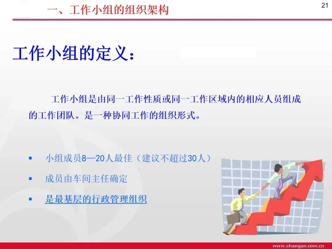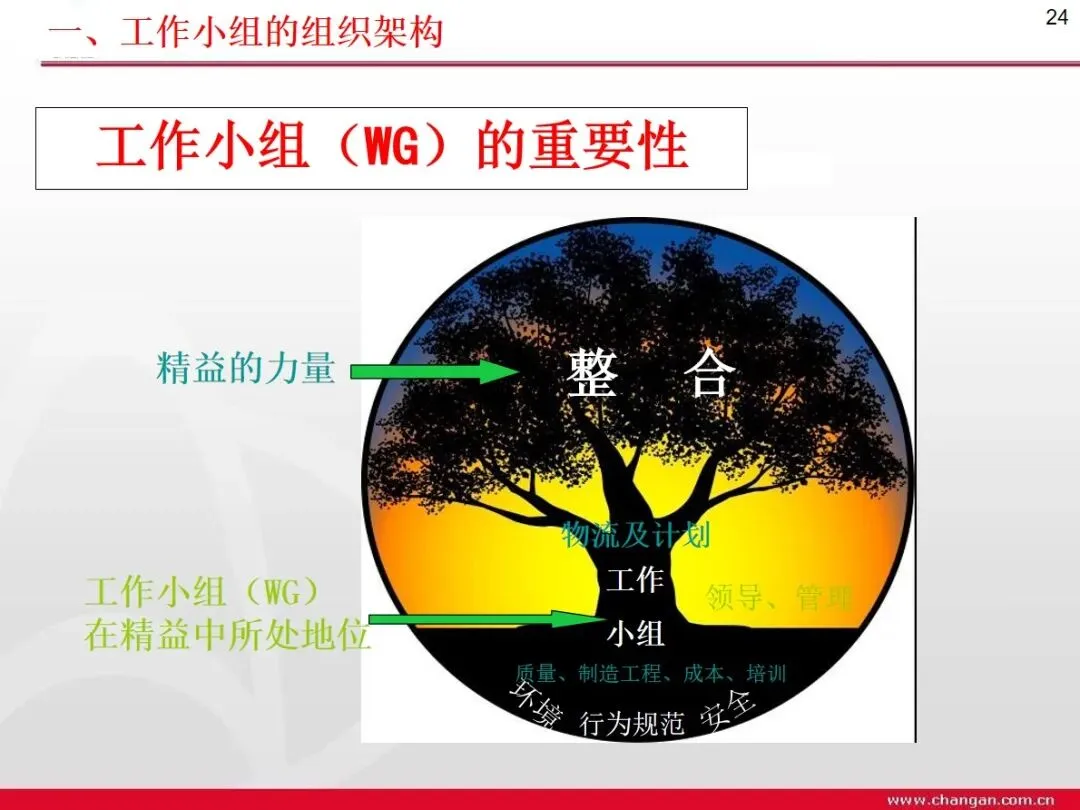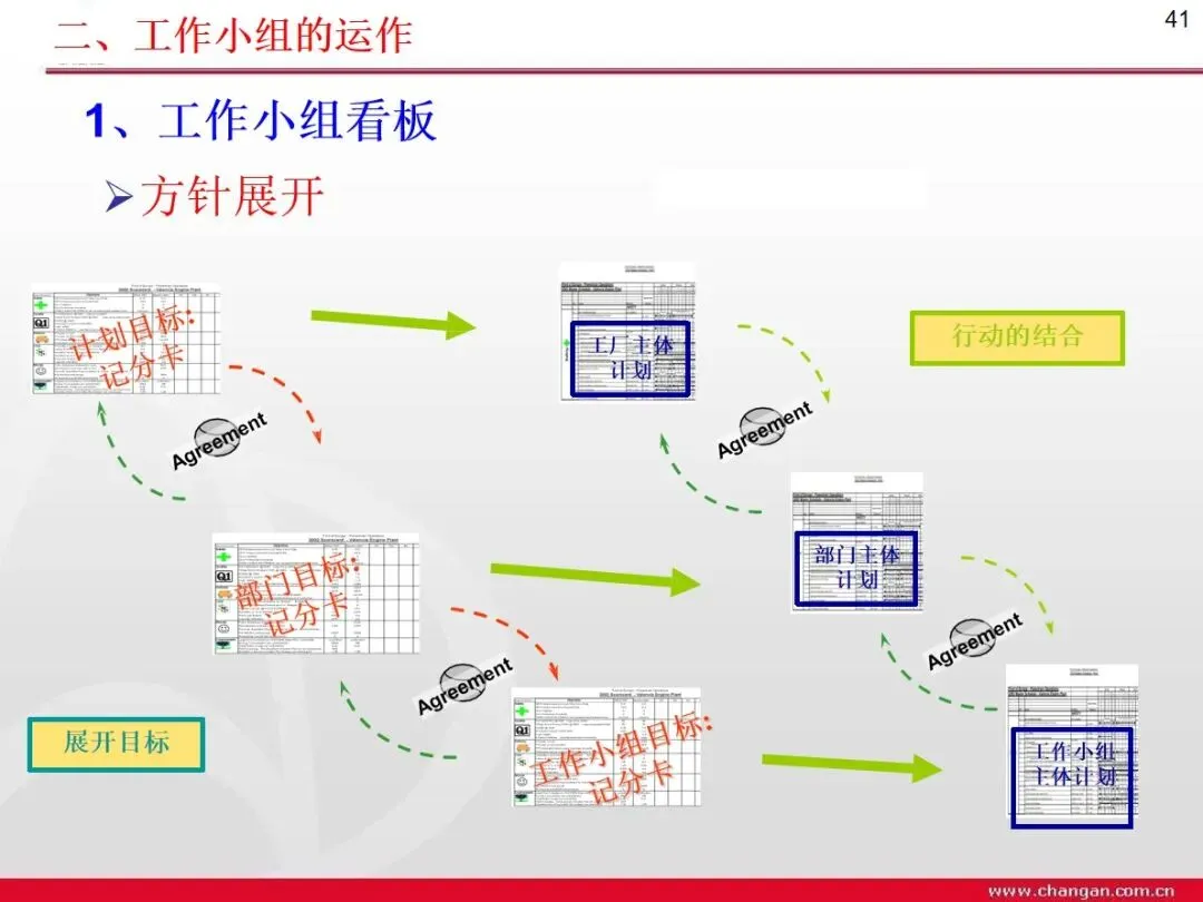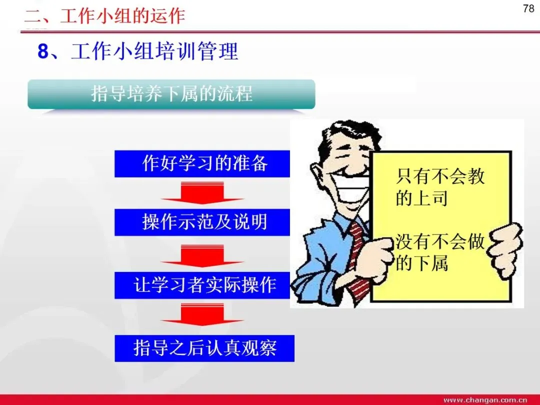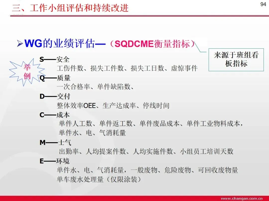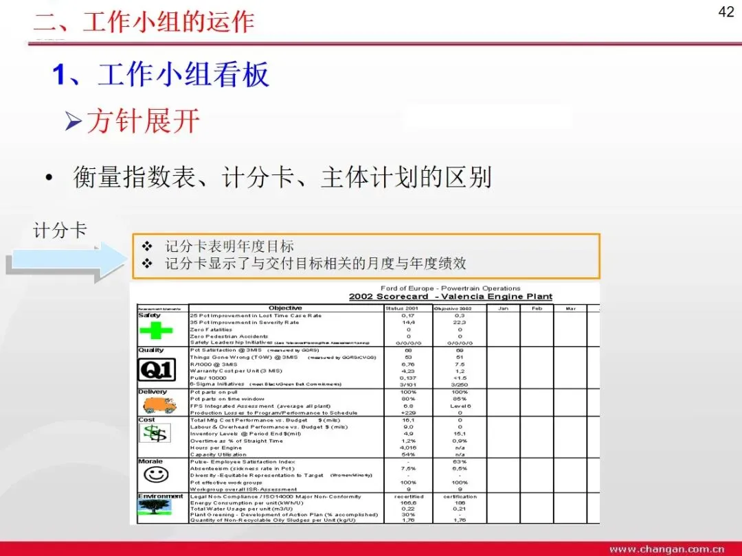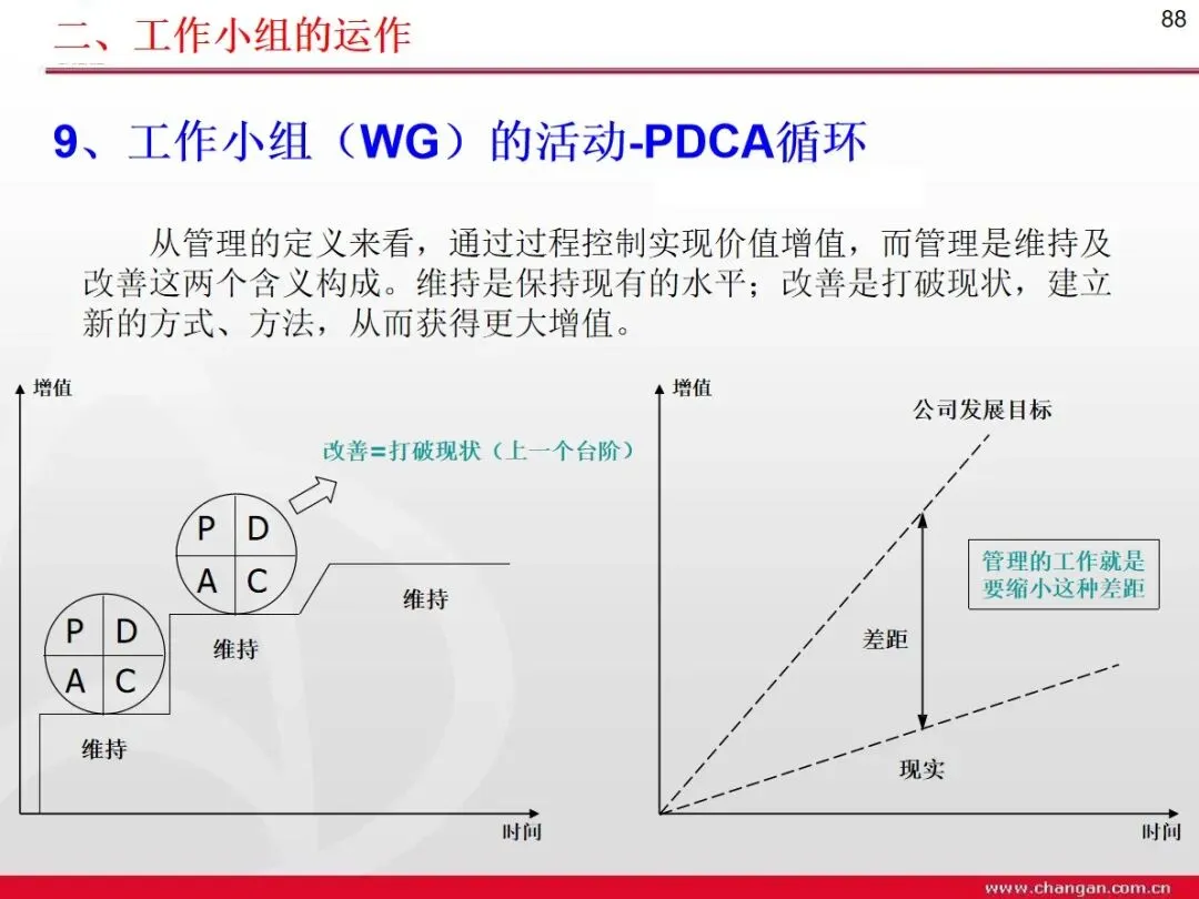 培训的核心是班组作业。工作小组人数以8~20个人为宜,并明确组长,工会组长,质量管理人员,安全管理人员等岗位责任,以“以人为本”和“生产改进”为核心,落实“基础管理”、“标准化操作”、“安全环保”、“质量控制”等8项工作任务。通过工作团队看板将政策与业绩数据可视化,每周约30分钟的团队会议进行双向交流;采用PDCA循环和质量管理七大方法来解决问题,通过提出合理化的改进意见来激励员工进行改进。