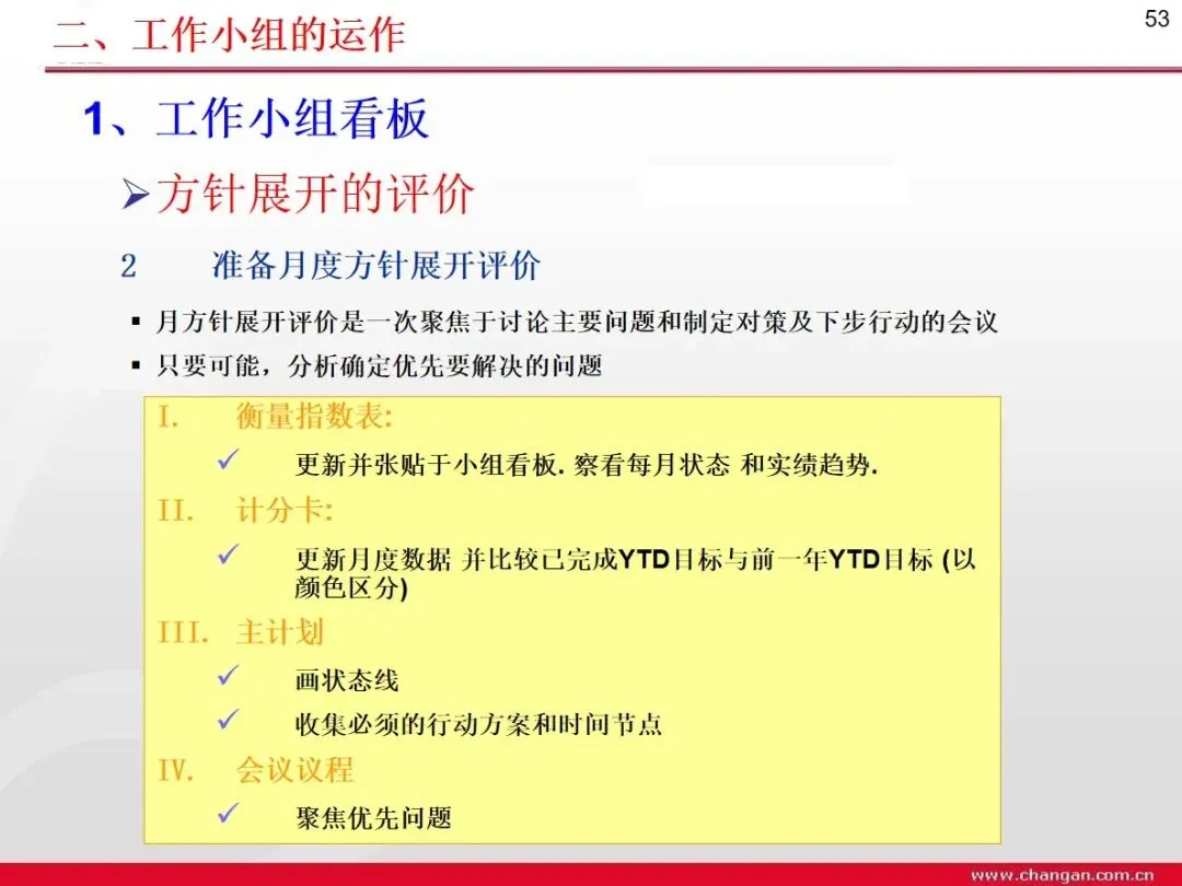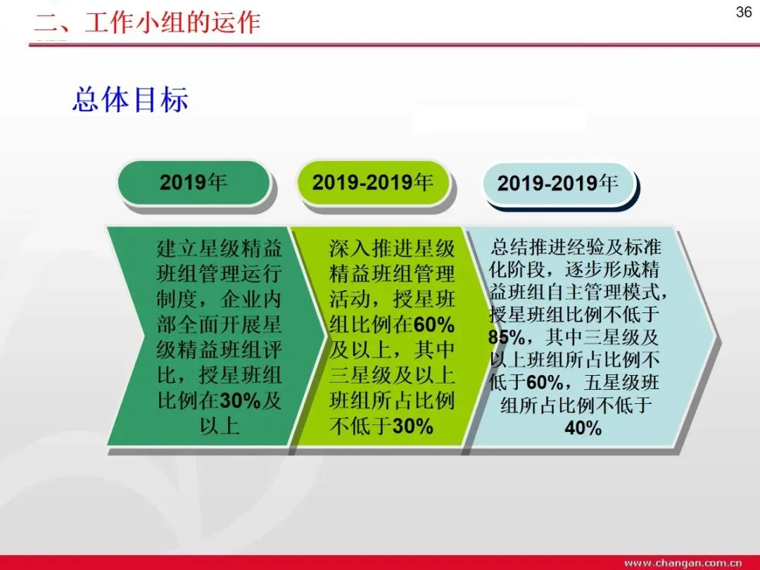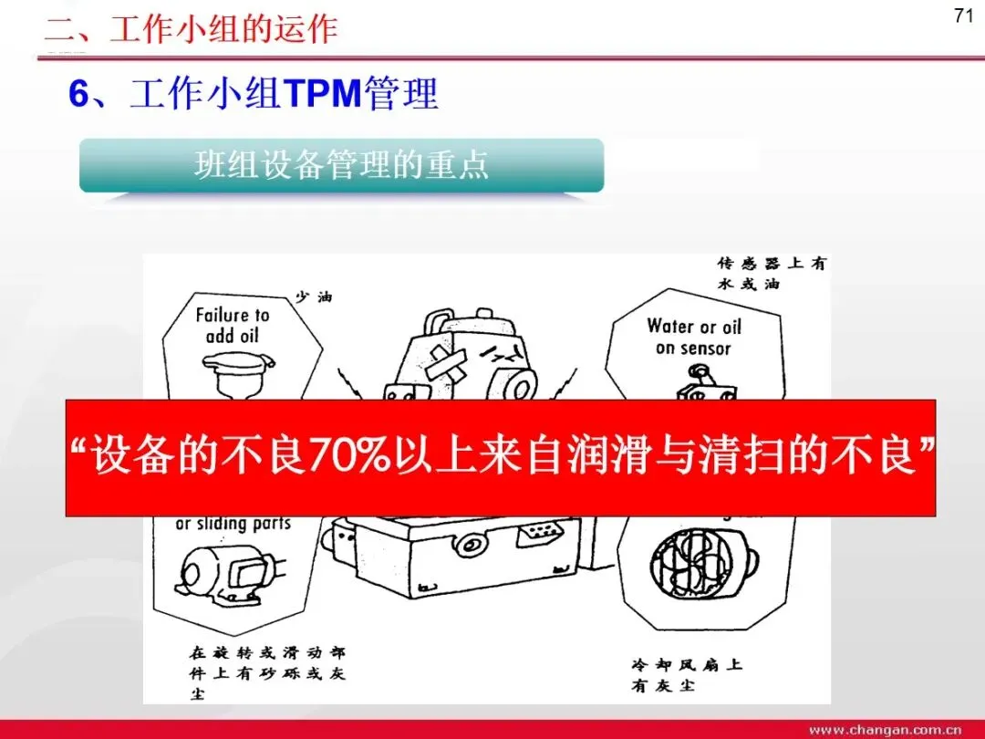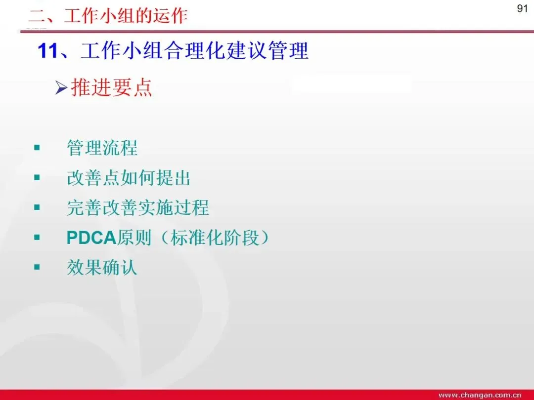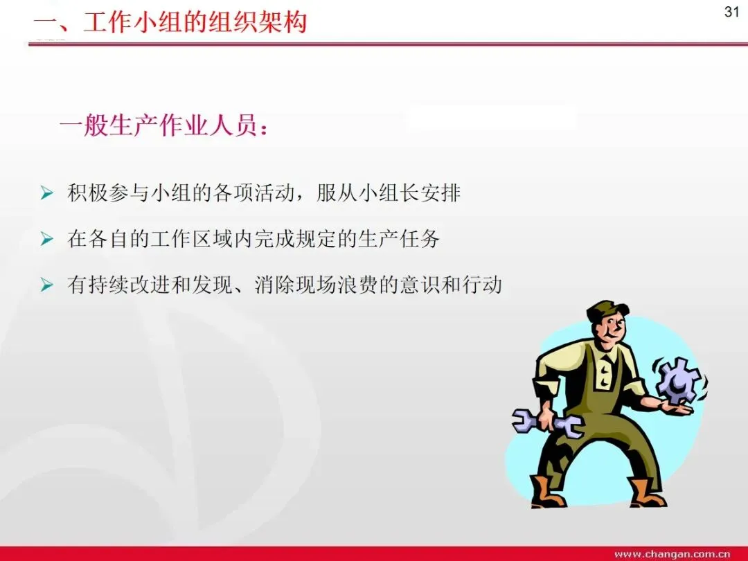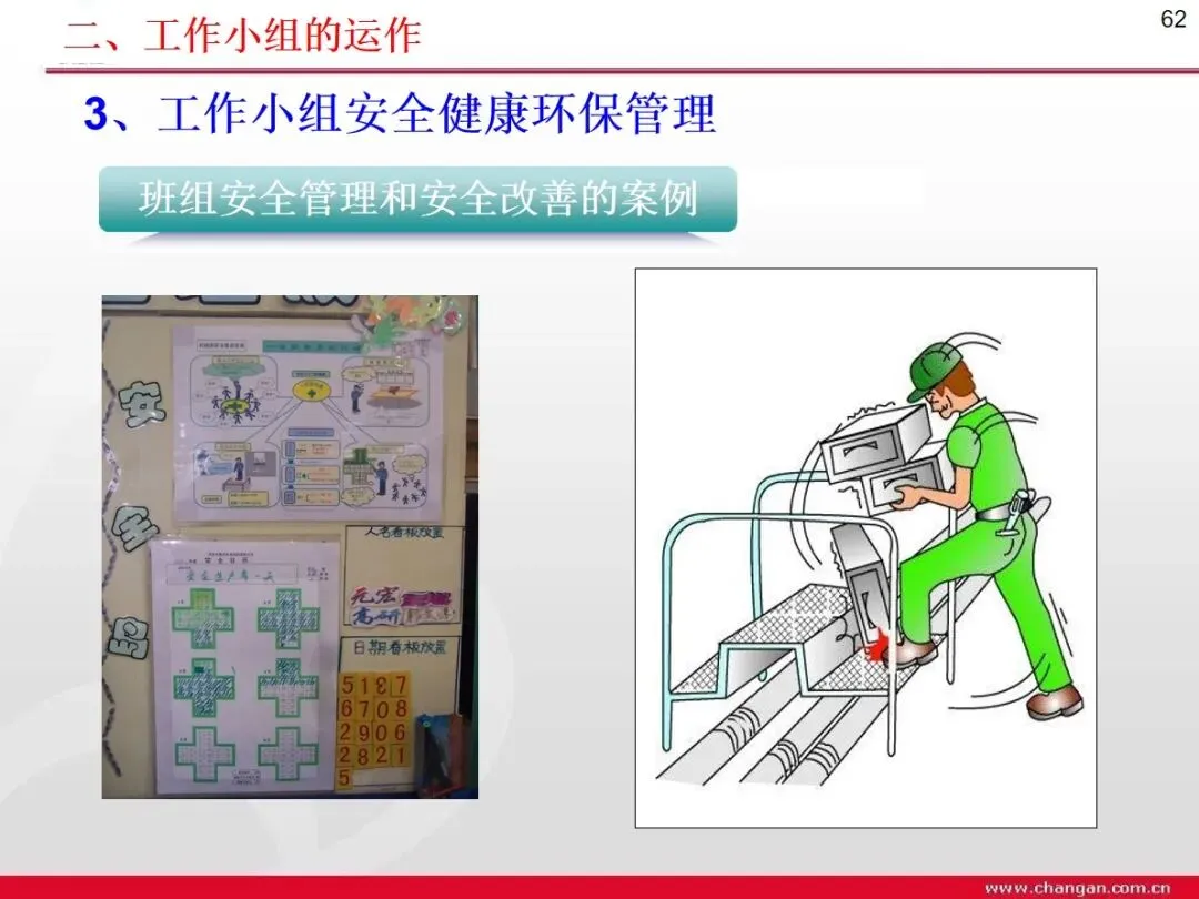 培训的核心是班组作业。工作小组人数以8~20个人为宜,并明确组长,工会组长,质量管理人员,安全管理人员等岗位责任,以“以人为本”和“生产改进”为核心,落实“基础管理”、“标准化操作”、“安全环保”、“质量控制”等8项工作任务。通过工作团队看板将政策与业绩数据可视化,每周约30分钟的团队会议进行双向交流;采用PDCA循环和质量管理七大方法来解决问题,通过提出合理化的改进意见来激励员工进行改进。