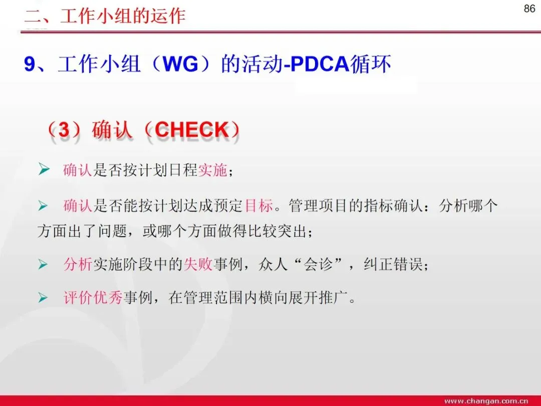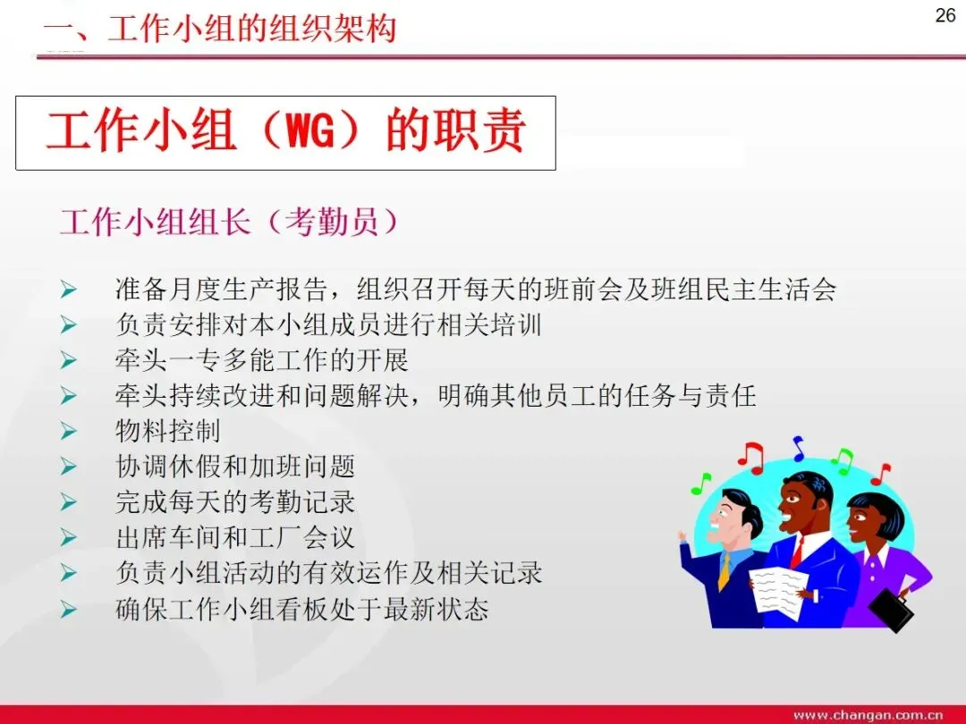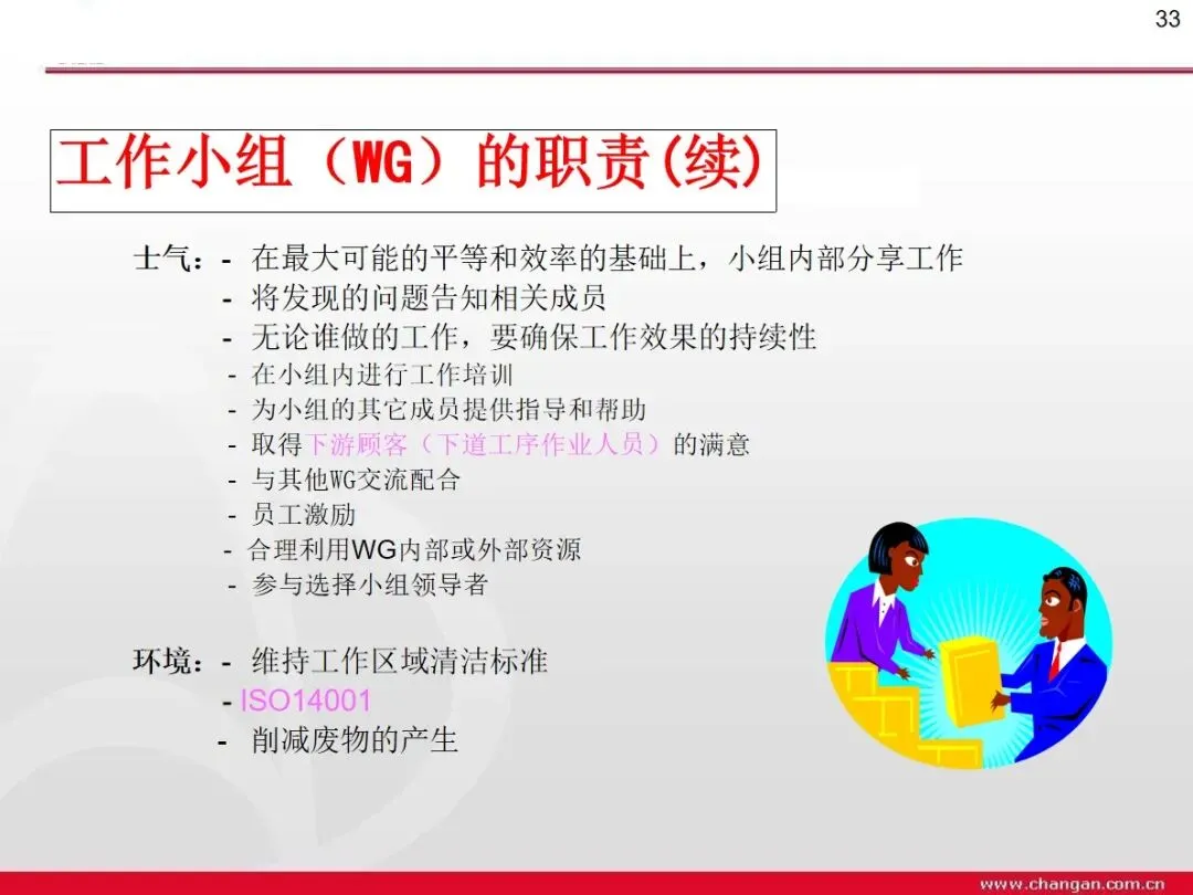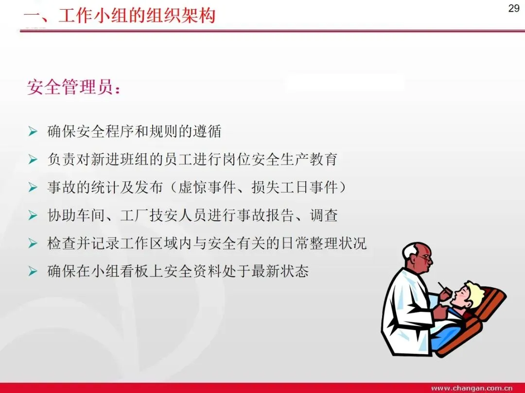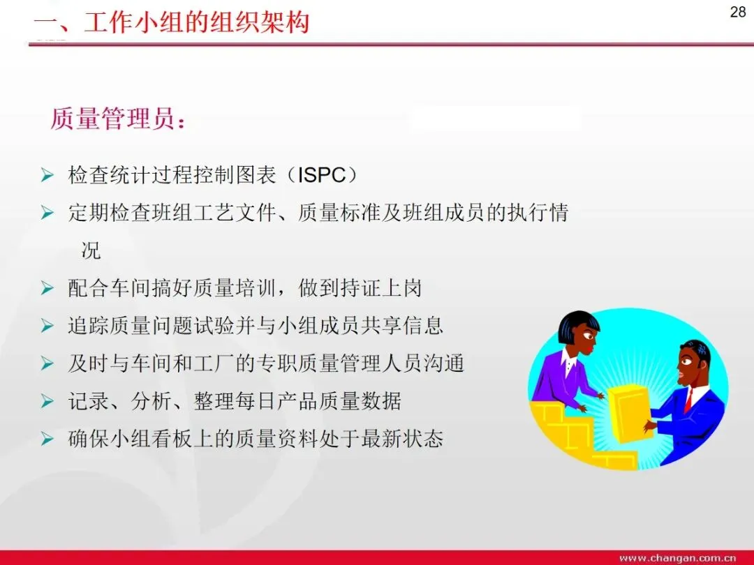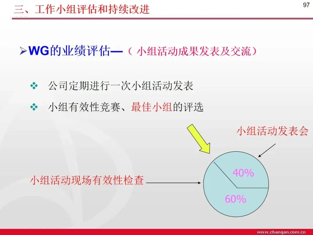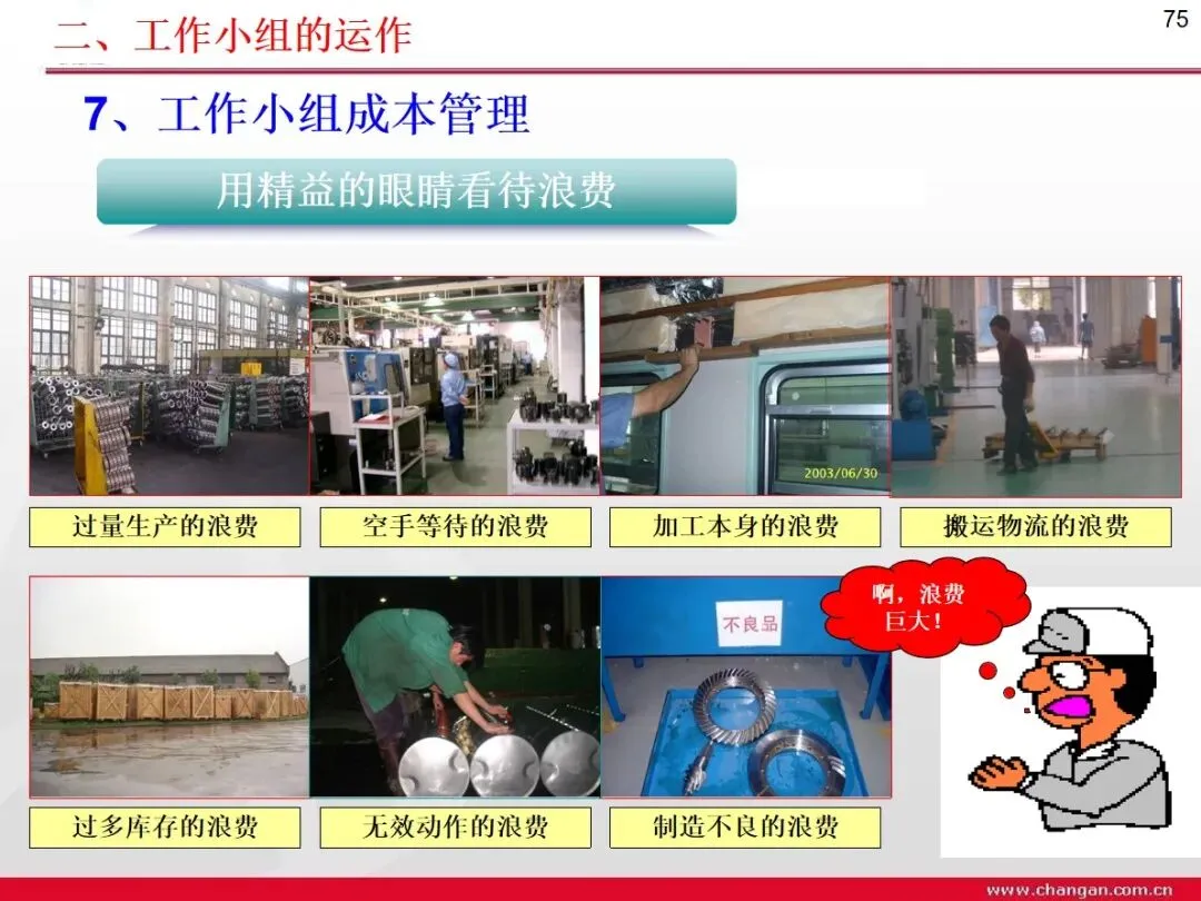 培训的核心是班组作业。工作小组人数以8~20个人为宜,并明确组长,工会组长,质量管理人员,安全管理人员等岗位责任,以“以人为本”和“生产改进”为核心,落实“基础管理”、“标准化操作”、“安全环保”、“质量控制”等8项工作任务。通过工作团队看板将政策与业绩数据可视化,每周约30分钟的团队会议进行双向交流;采用PDCA循环和质量管理七大方法来解决问题,通过提出合理化的改进意见来激励员工进行改进。