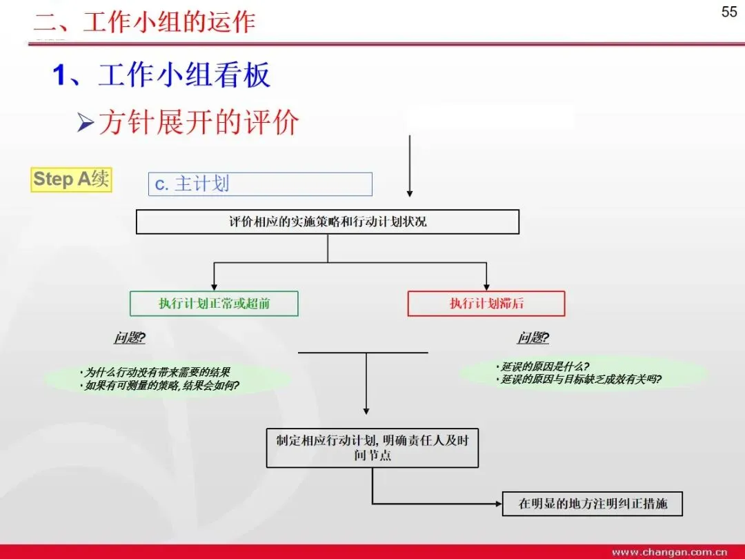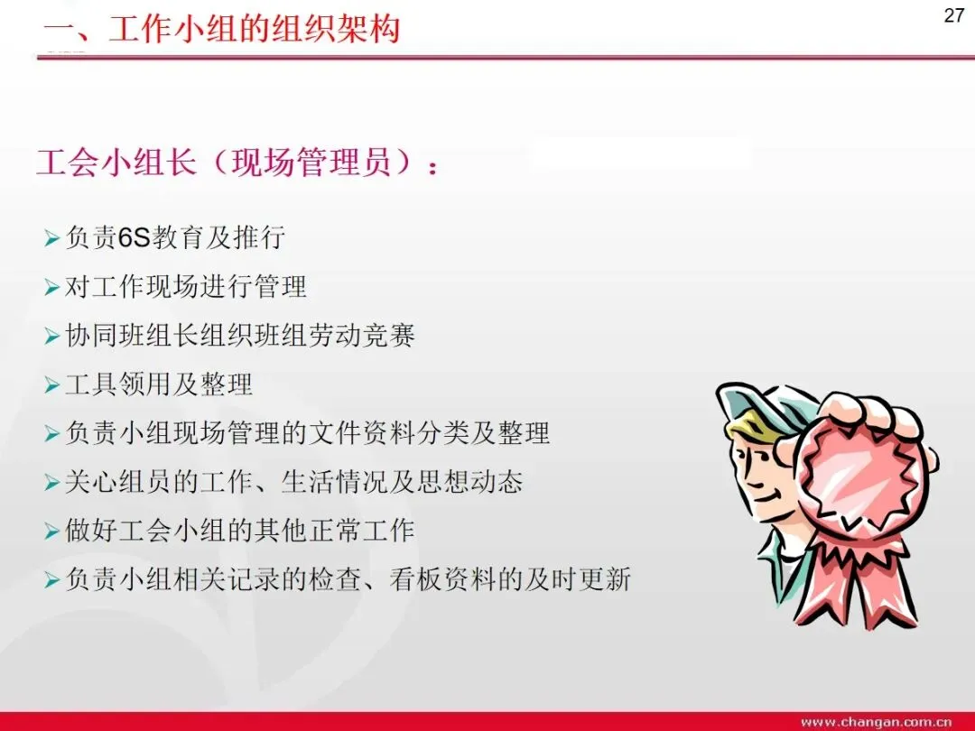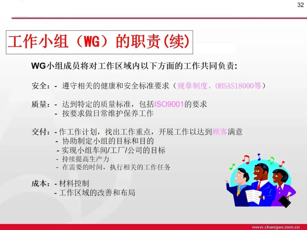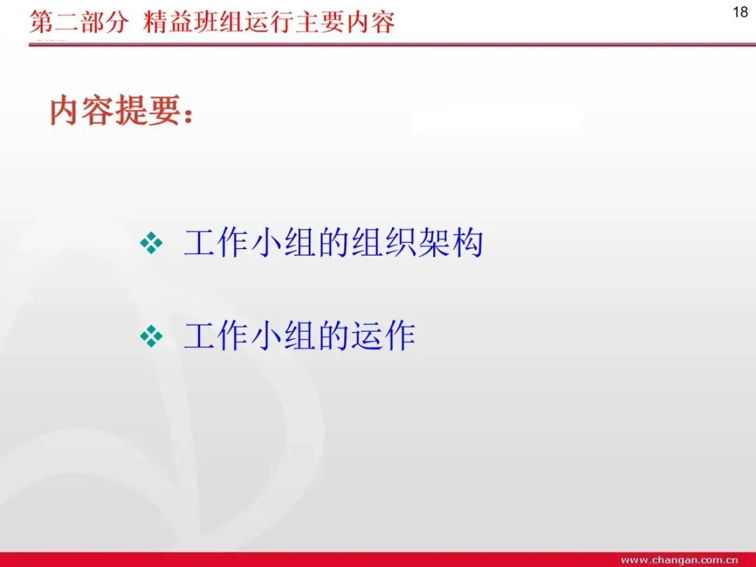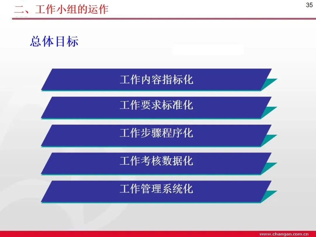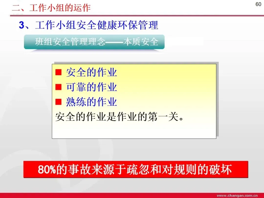 培训的核心是班组作业。工作小组人数以8~20个人为宜,并明确组长,工会组长,质量管理人员,安全管理人员等岗位责任,以“以人为本”和“生产改进”为核心,落实“基础管理”、“标准化操作”、“安全环保”、“质量控制”等8项工作任务。通过工作团队看板将政策与业绩数据可视化,每周约30分钟的团队会议进行双向交流;采用PDCA循环和质量管理七大方法来解决问题,通过提出合理化的改进意见来激励员工进行改进。