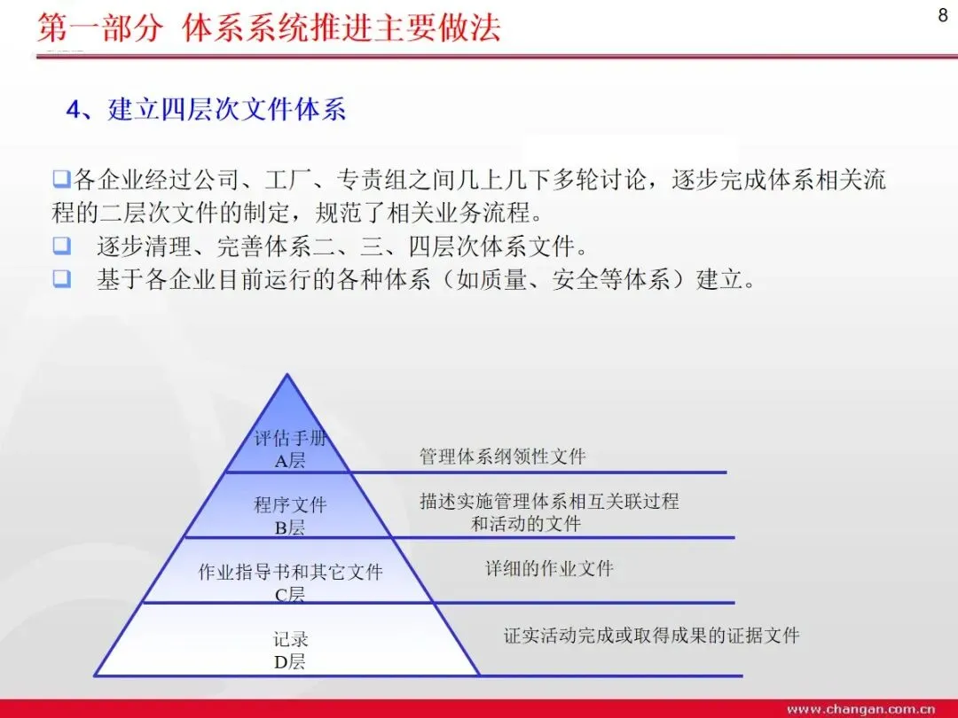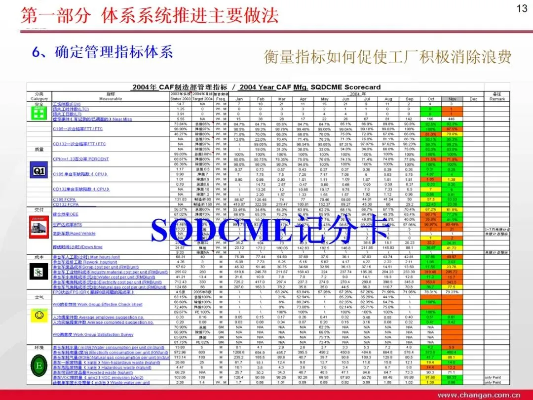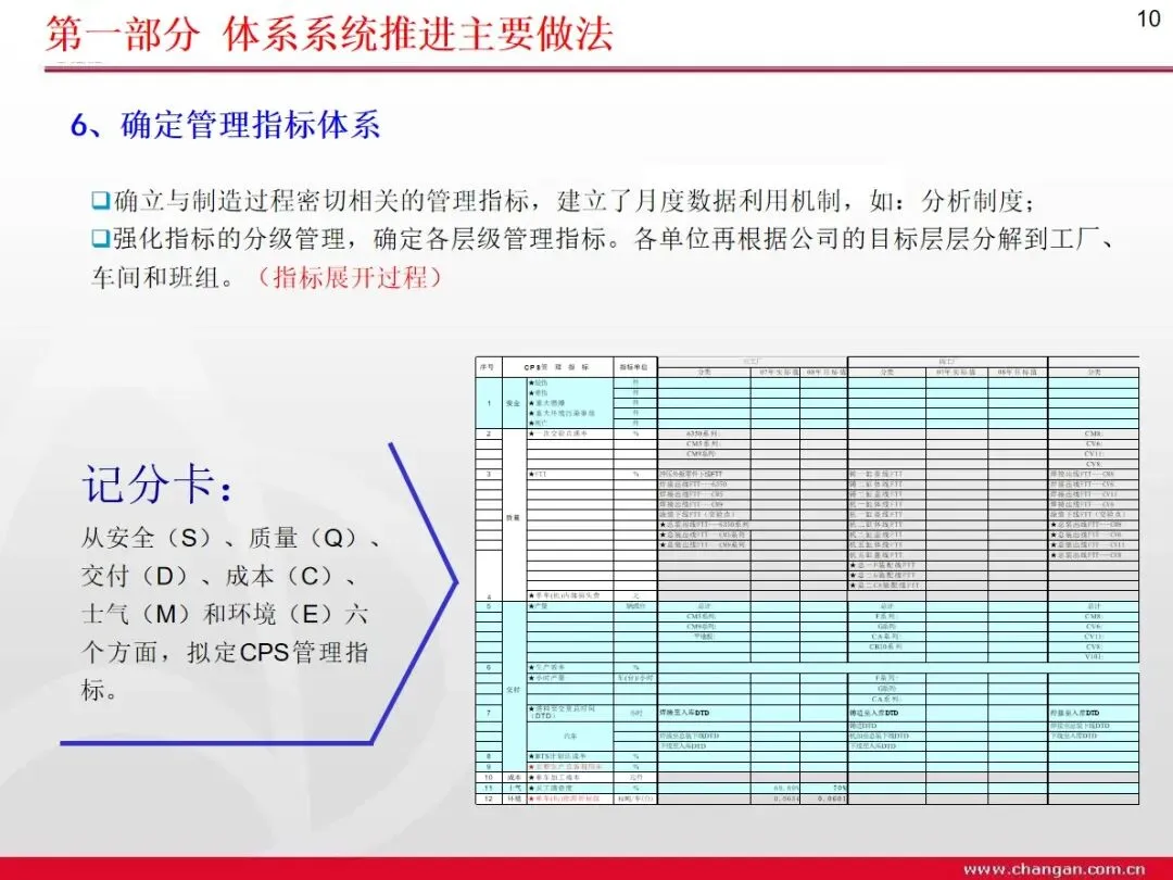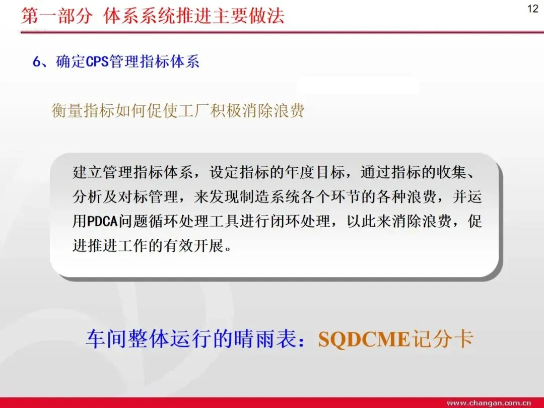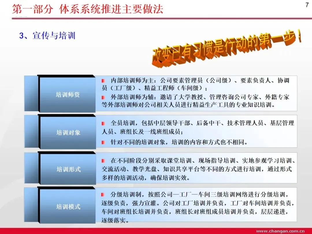 培训的基础是体系和系统的推进。各企业应该参考长安的CCPS (前身为 SPS),并根据自己的特点,制定出精益生产的纲领性文件;建立从公司领导班子到基层班组三级的矩阵型组织体系,明确推进、统筹、考核等各级责任。通过公司内部的报纸、广播、网站等媒体进行宣传,形成全员参与的氛围,通过公司-工厂-车间的三级培训体系,以内部讲师为主,外部专家为辅的方式,通过课堂讲授、实地指导、参观考察等方式,达到全员培训的目的。同时,建立了A-D四级文件管理体系,建立了SQDCME (Security, Quality, Delivery, Principal, Corporate, Spiral, Environment)管理体系,以管理看板和专用服务器为支撑,形成了体系、流程和主题活动的标准化运作模式,并以PDCA循环为基础,不断优化。