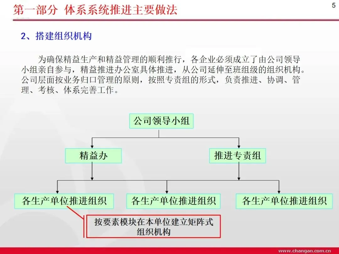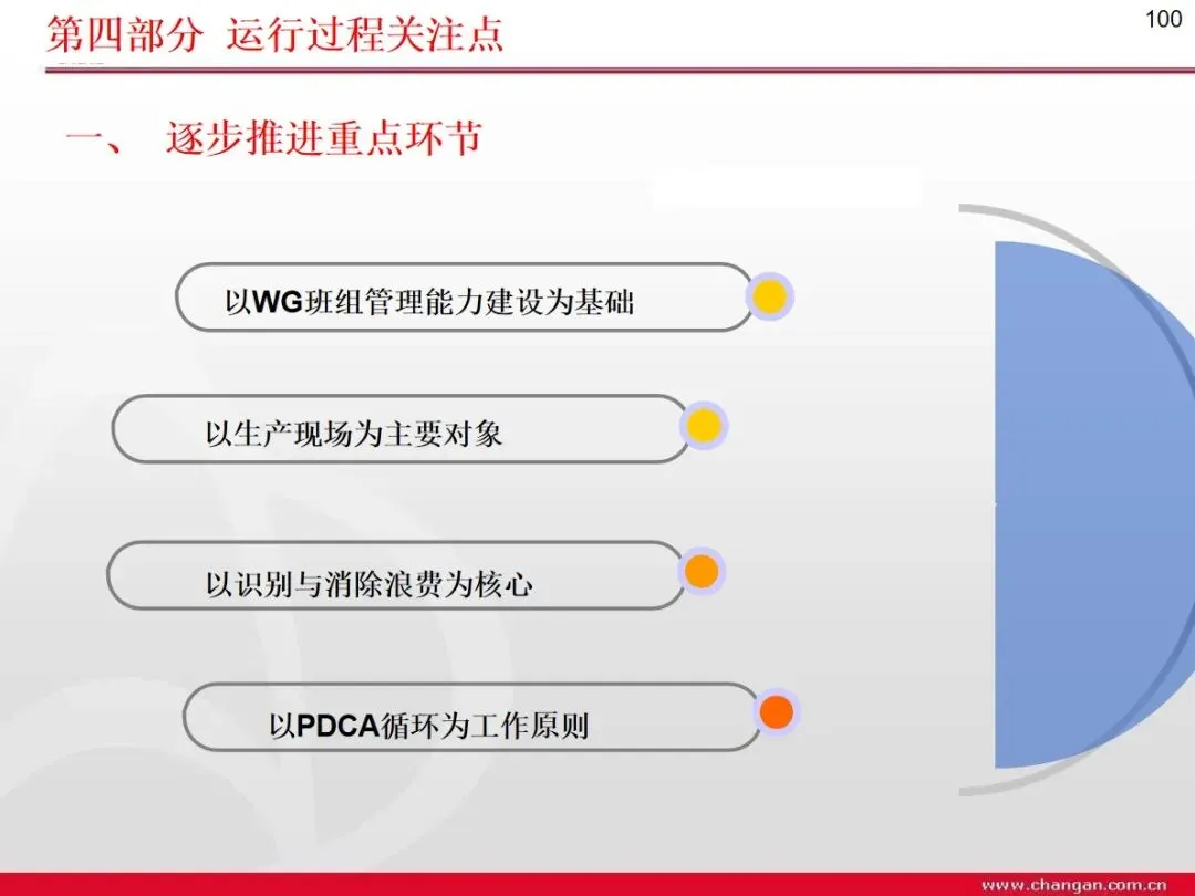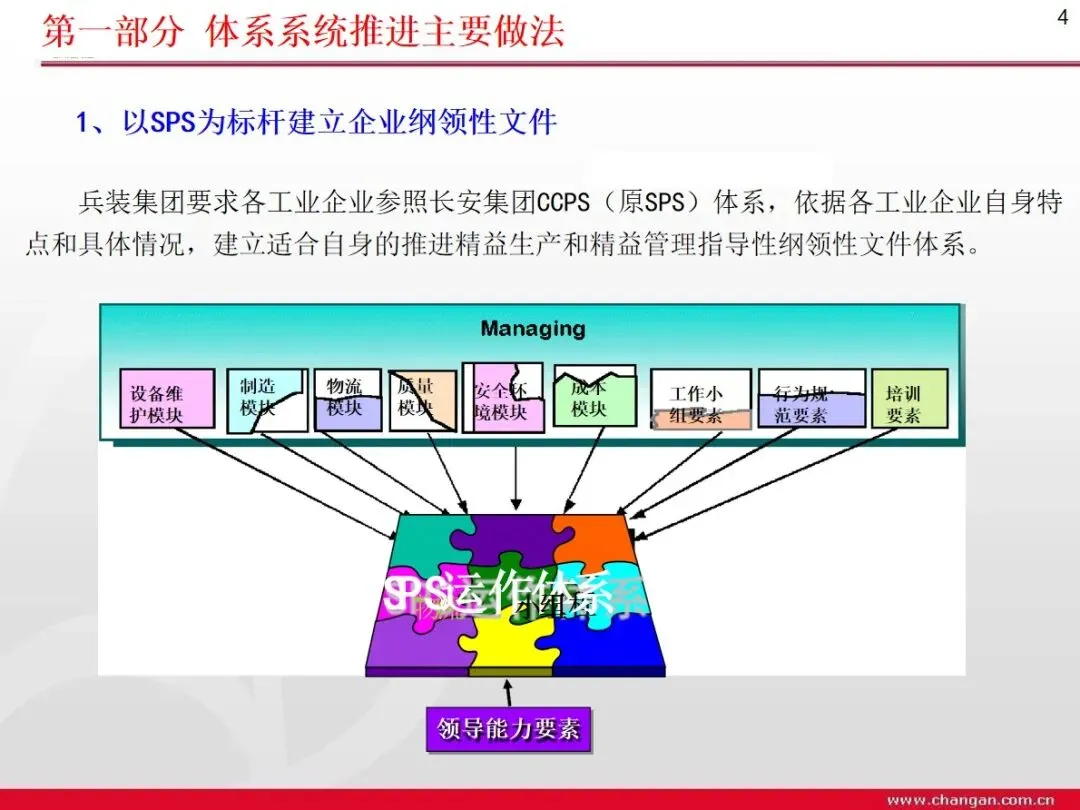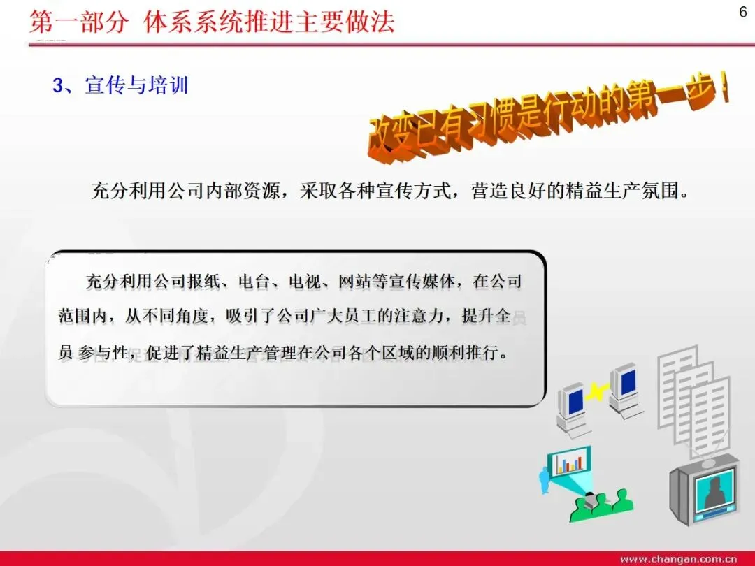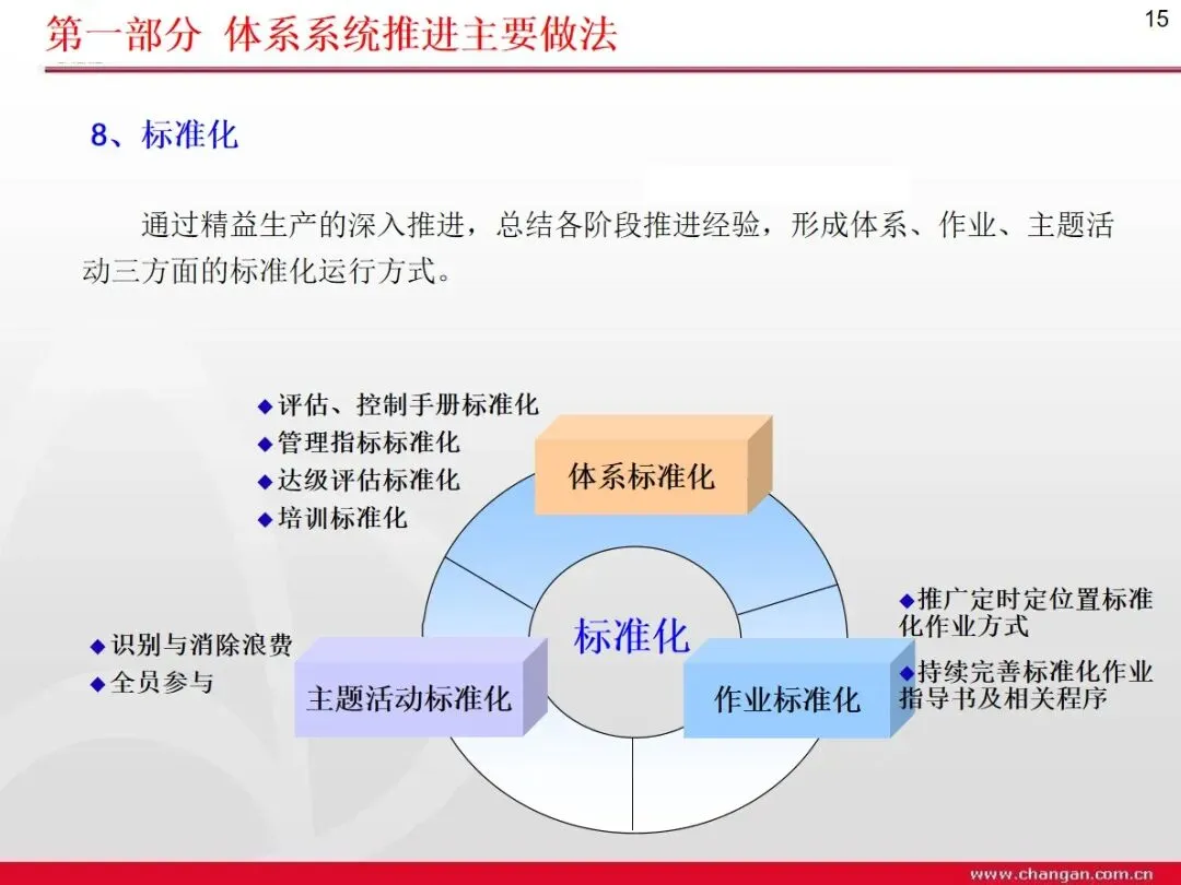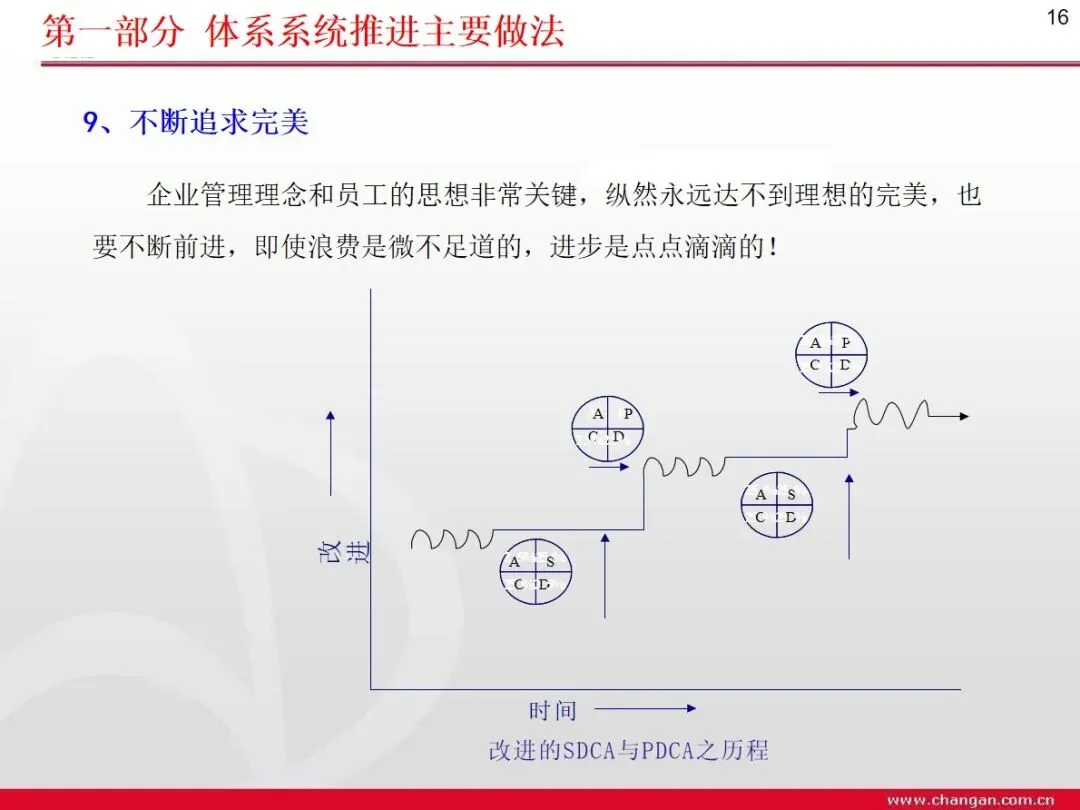 培训的基础是体系和系统的推进。各企业应该参考长安的CCPS (前身为 SPS),并根据自己的特点,制定出精益生产的纲领性文件;建立从公司领导班子到基层班组三级的矩阵型组织体系,明确推进、统筹、考核等各级责任。通过公司内部的报纸、广播、网站等媒体进行宣传,形成全员参与的氛围,通过公司-工厂-车间的三级培训体系,以内部讲师为主,外部专家为辅的方式,通过课堂讲授、实地指导、参观考察等方式,达到全员培训的目的。同时,建立了A-D四级文件管理体系,建立了SQDCME (Security, Quality, Delivery, Principal, Corporate, Spiral, Environment)管理体系,以管理看板和专用服务器为支撑,形成了体系、流程和主题活动的标准化运作模式,并以PDCA循环为基础,不断优化。