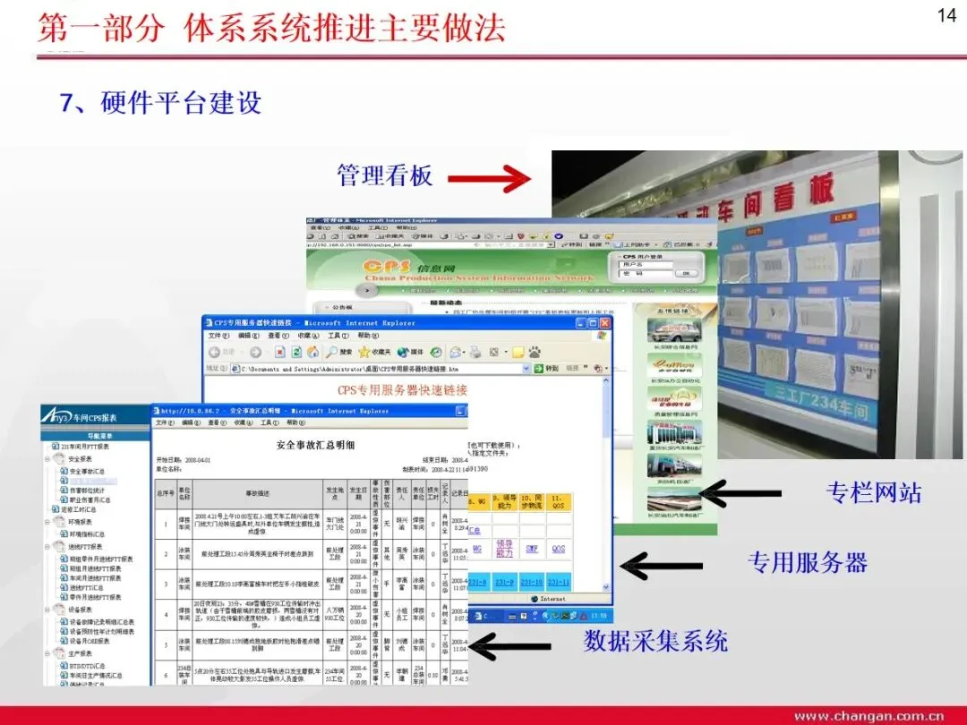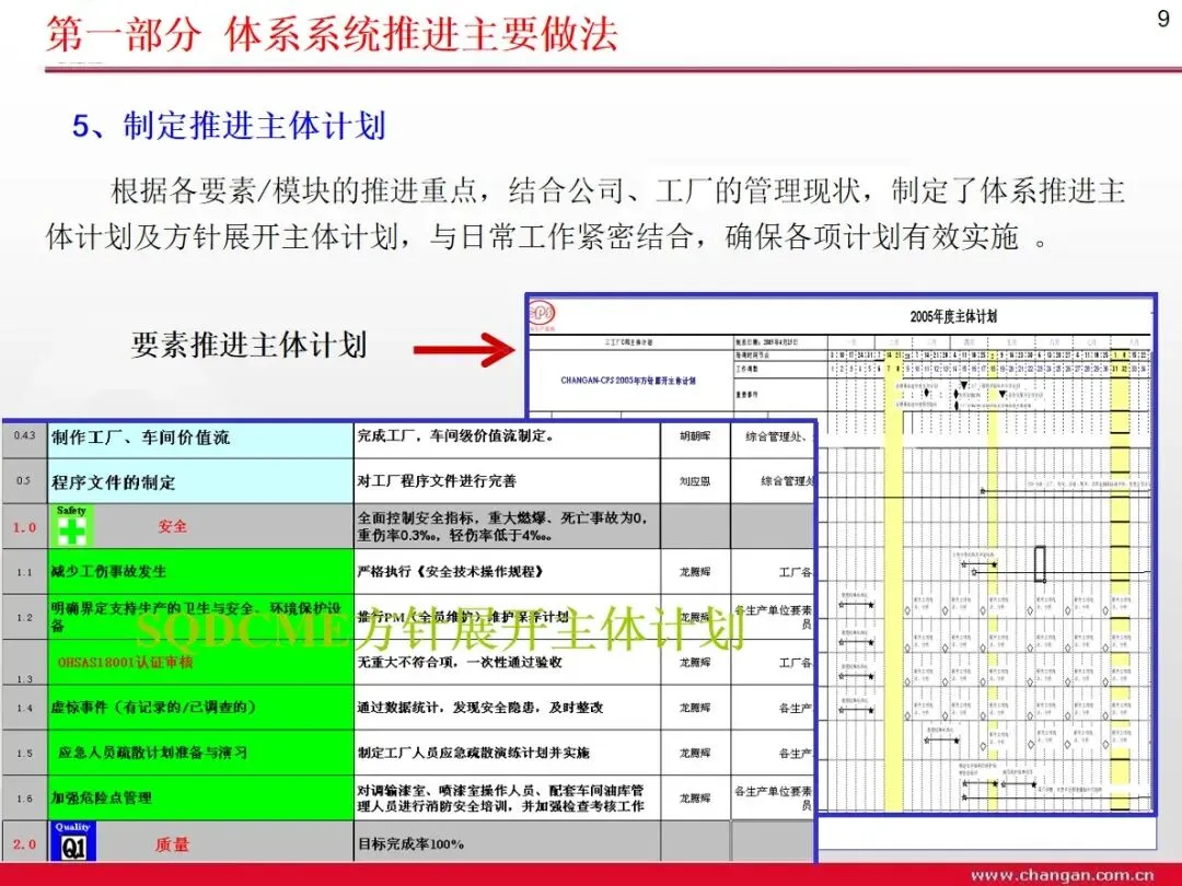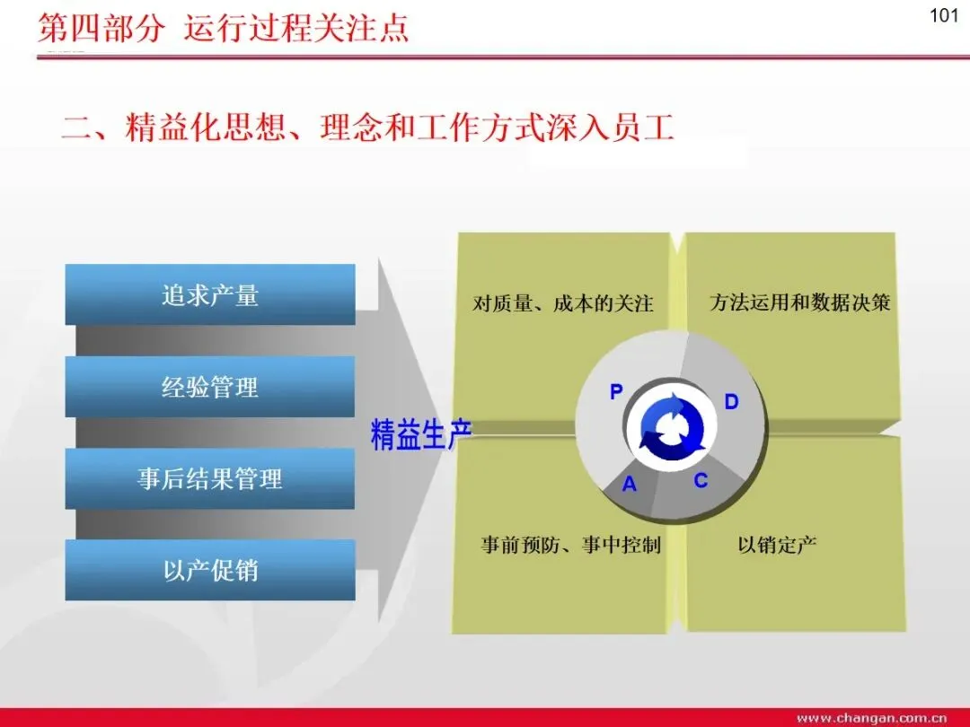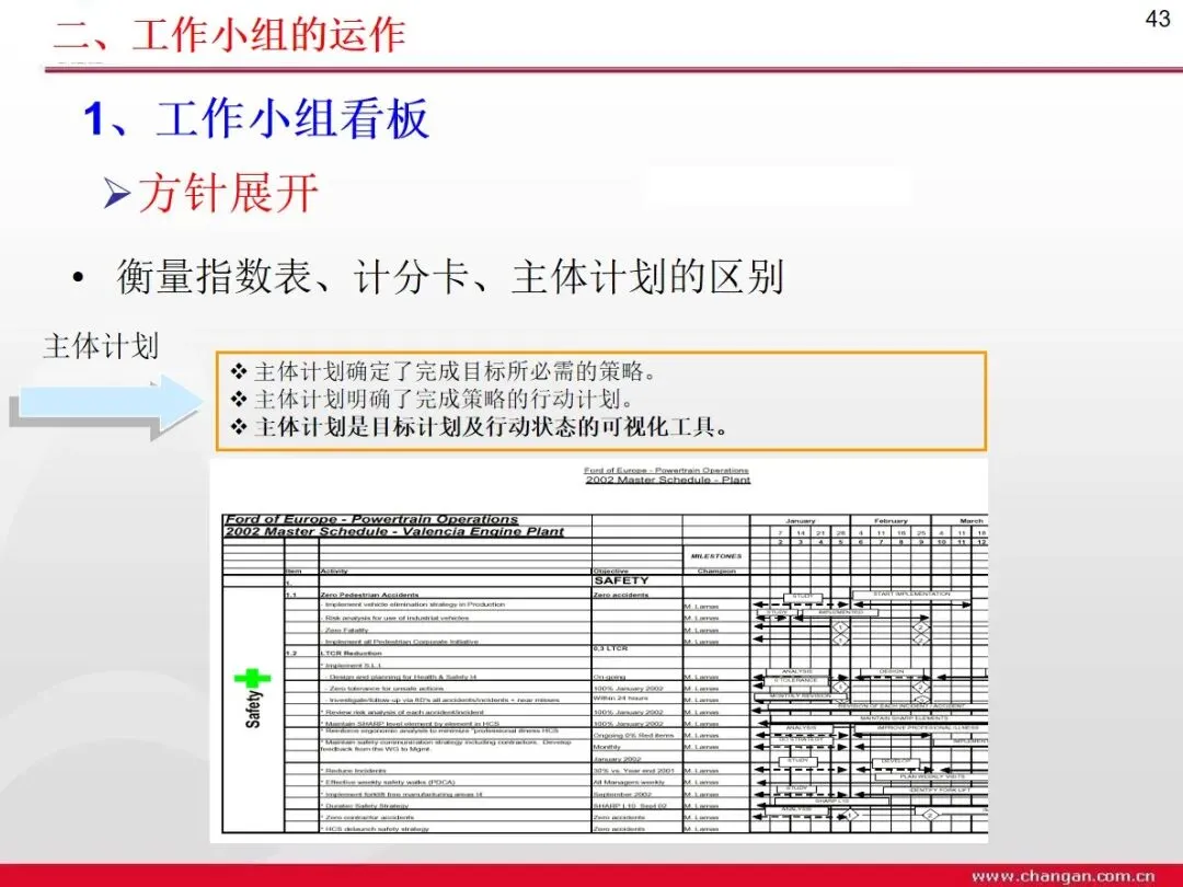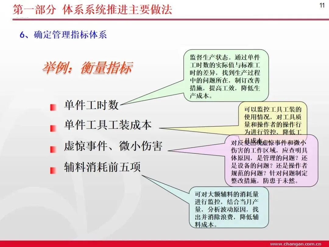 培训的基础是体系和系统的推进。各企业应该参考长安的CCPS (前身为 SPS),并根据自己的特点,制定出精益生产的纲领性文件;建立从公司领导班子到基层班组三级的矩阵型组织体系,明确推进、统筹、考核等各级责任。通过公司内部的报纸、广播、网站等媒体进行宣传,形成全员参与的氛围,通过公司-工厂-车间的三级培训体系,以内部讲师为主,外部专家为辅的方式,通过课堂讲授、实地指导、参观考察等方式,达到全员培训的目的。同时,建立了A-D四级文件管理体系,建立了SQDCME (Security, Quality, Delivery, Principal, Corporate, Spiral, Environment)管理体系,以管理看板和专用服务器为支撑,形成了体系、流程和主题活动的标准化运作模式,并以PDCA循环为基础,不断优化。