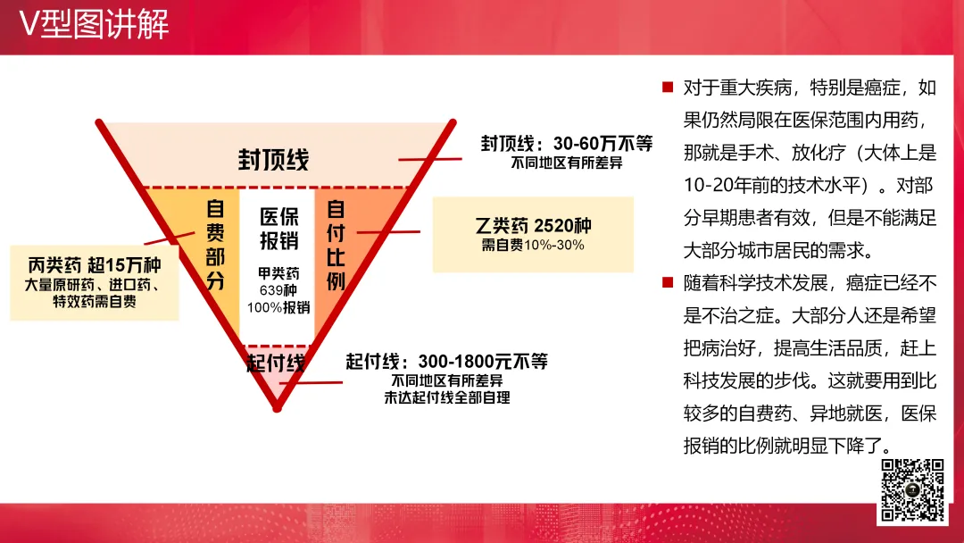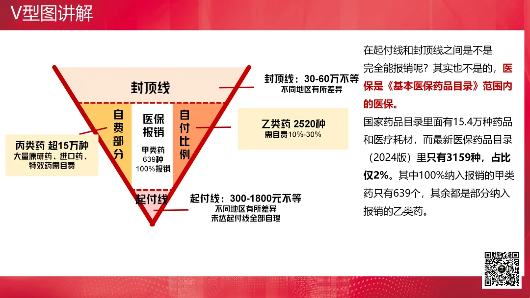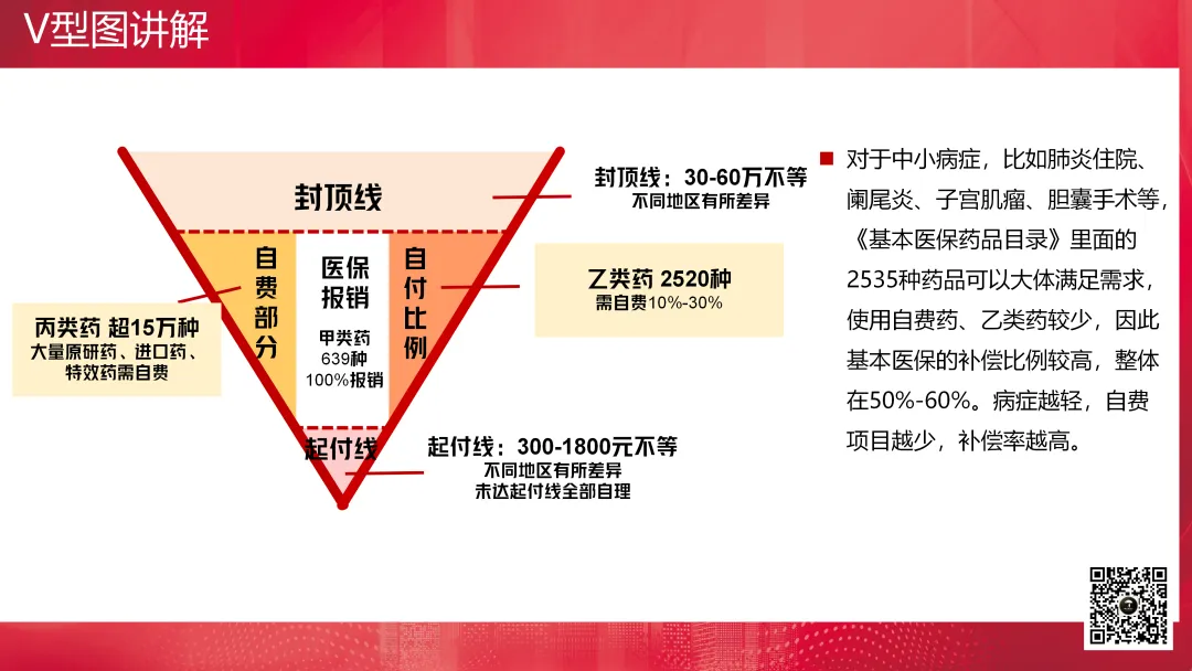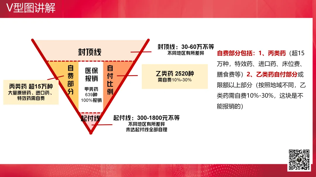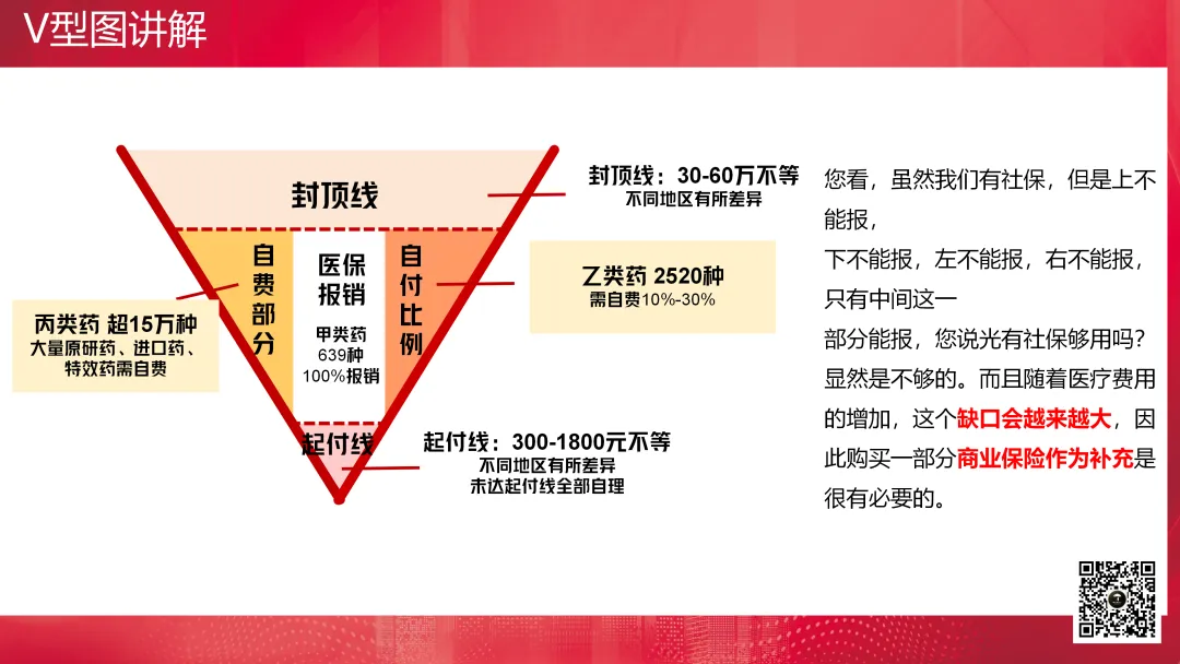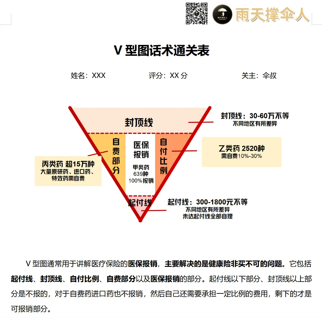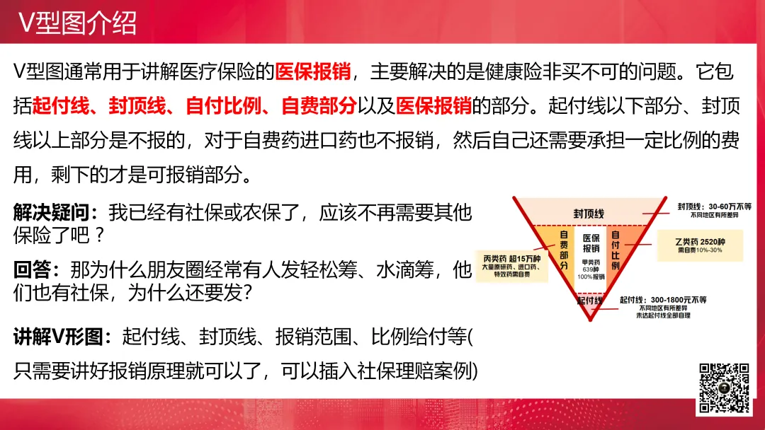 V型图通常用于讲解医疗保险的医保报销,主要解决的是健康险非买不可的问题。它包括起付线、封顶线、自付比例、自费部分以及医保报销的部分。起付线以下部分、封顶线以上部分是不报的,对于自费药进口药也不报销,然后自己还需要承担一定比例的费用,剩下的才是可报销部分。