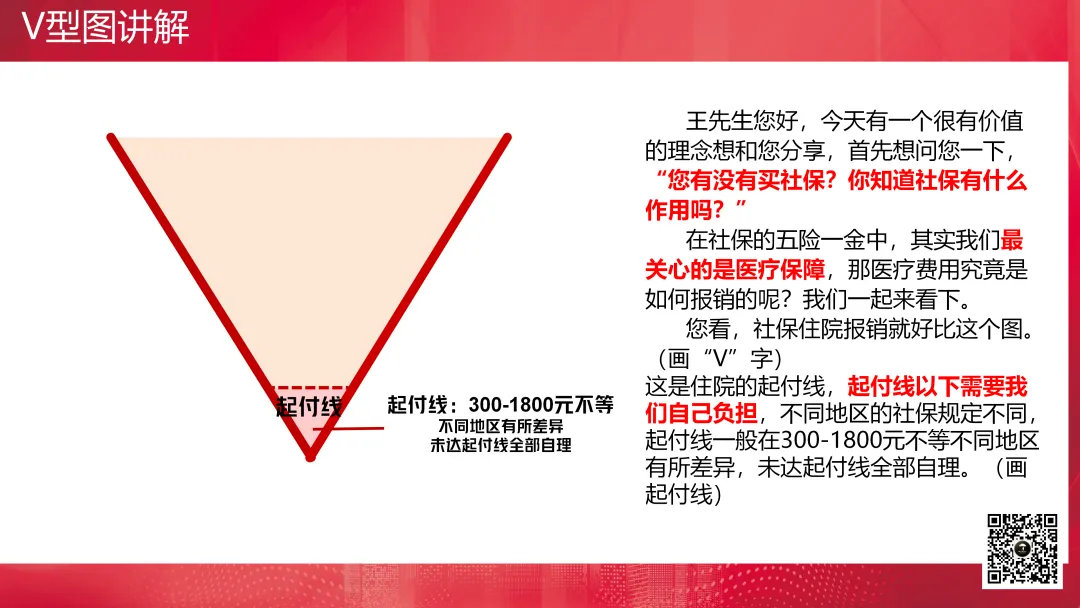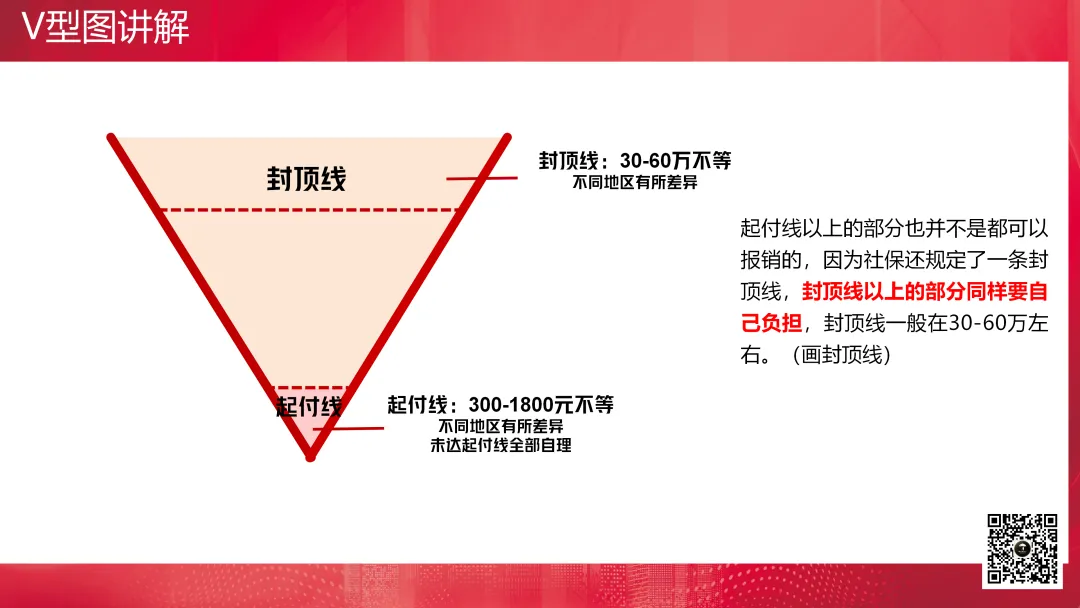 讲解V形图:起付线、封顶线、报销范围、比例给付等(只需要讲好报销原理就可以了,可以插入社保理赔案例)