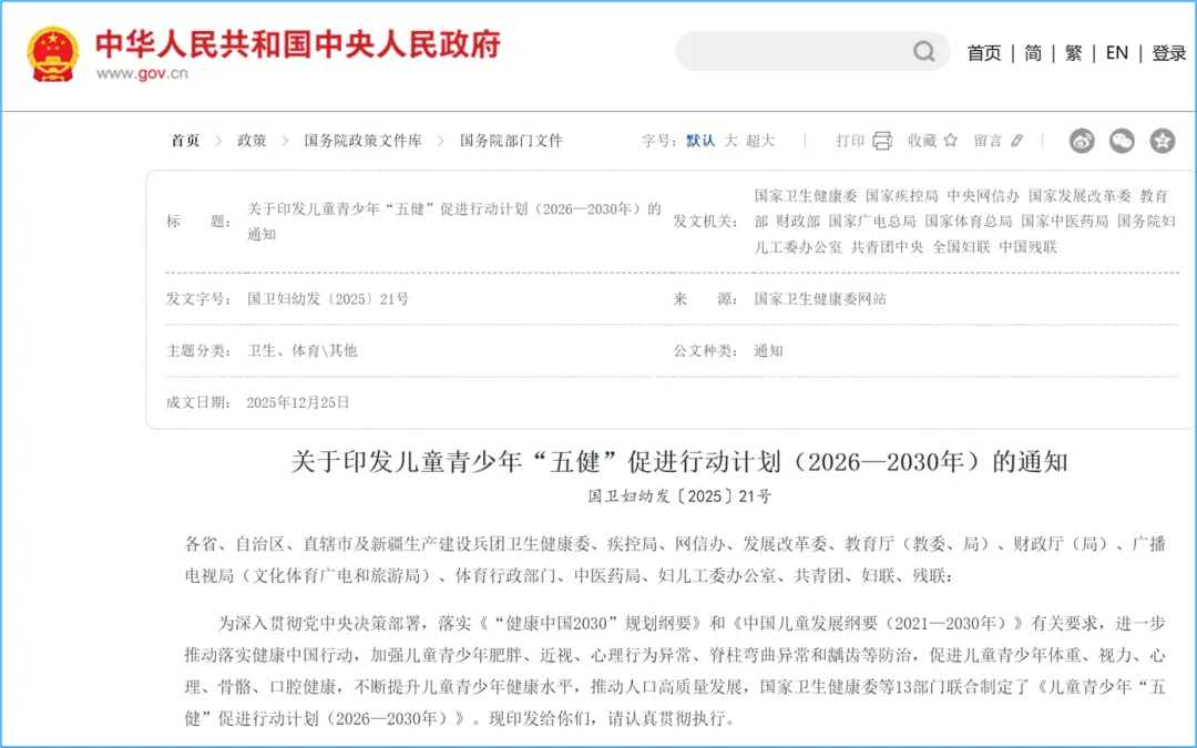 为落实《“健康中国 2030” 规划纲要》等相关要求,加强儿童青少年肥胖、近视等常见健康问题防治,我国制定《儿童青少年 “五健” 促进行动计划(2026-2030 年)》,聚焦体重、视力、心理、骨骼、口腔健康,构建全方位健康促进体系。