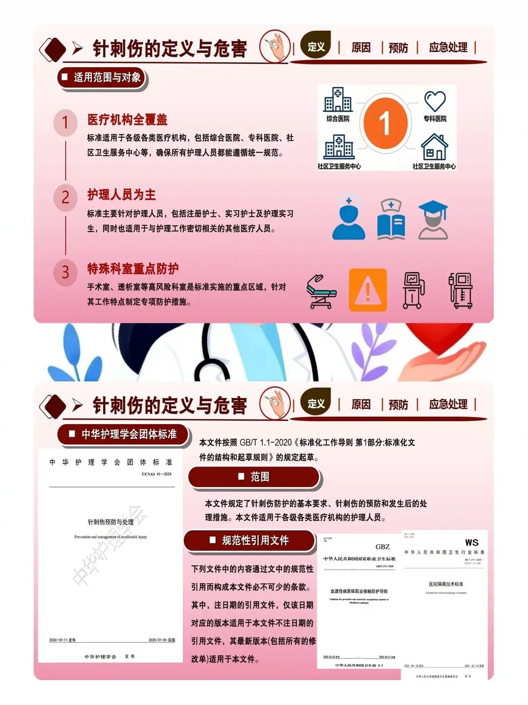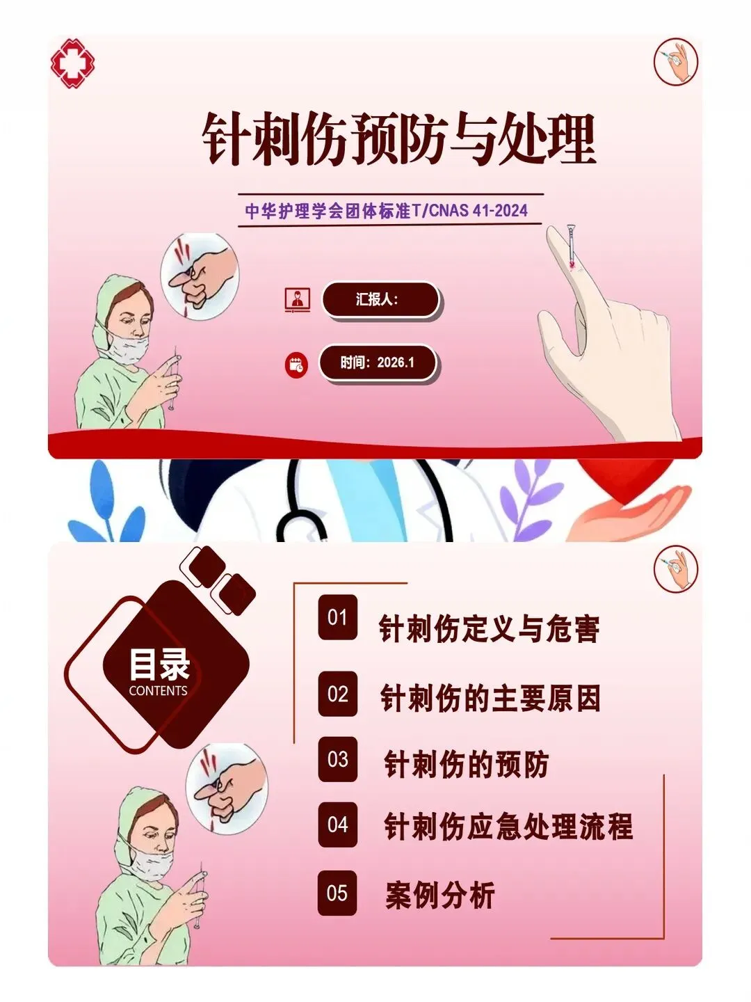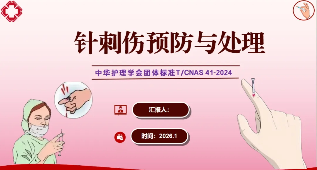 大家好!今天我们聚焦护理工作中的重要安全议题 —— 针刺伤的预防与处理。作为高频职业风险,针刺伤不仅可能导致乙肝、丙肝、艾滋病等 20 余种血源性疾病传播,更会给医护人员带来身体、心理与经济的多重负担。接下来,我们将结合中华护理学会 T/CNAS 41-2024 团体标准,系统梳理相关知识与实操要点。