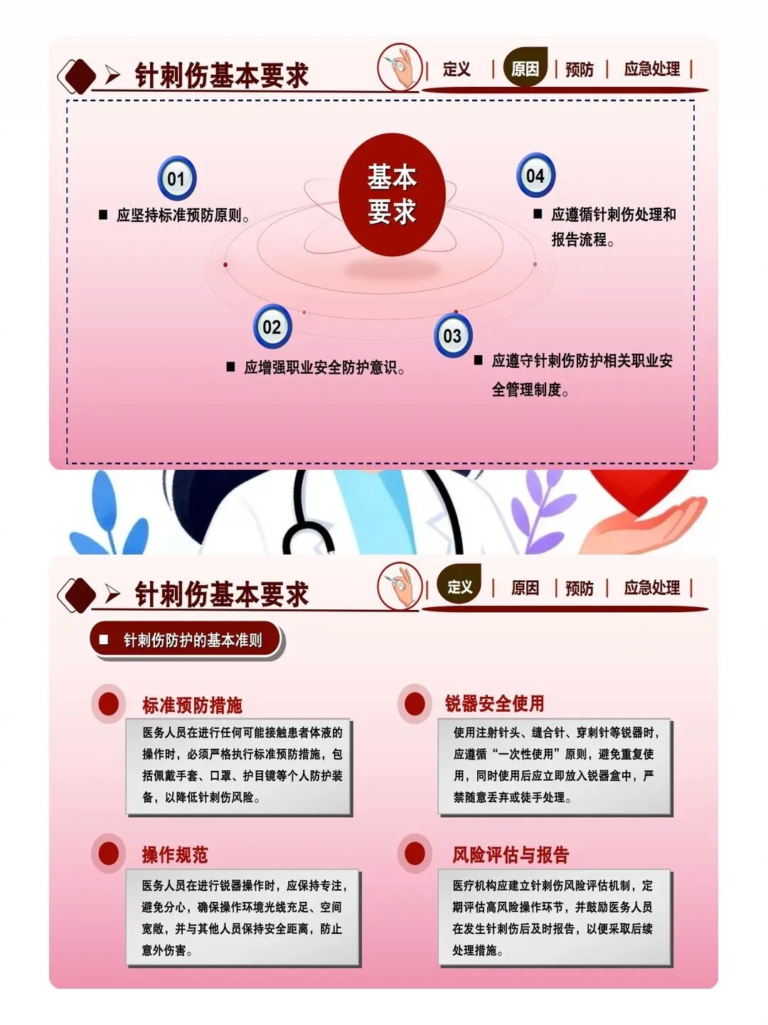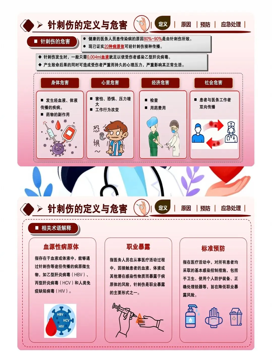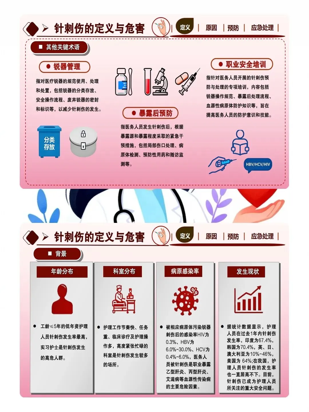 大家好!今天我们聚焦护理工作中的重要安全议题 —— 针刺伤的预防与处理。作为高频职业风险,针刺伤不仅可能导致乙肝、丙肝、艾滋病等 20 余种血源性疾病传播,更会给医护人员带来身体、心理与经济的多重负担。接下来,我们将结合中华护理学会 T/CNAS 41-2024 团体标准,系统梳理相关知识与实操要点。