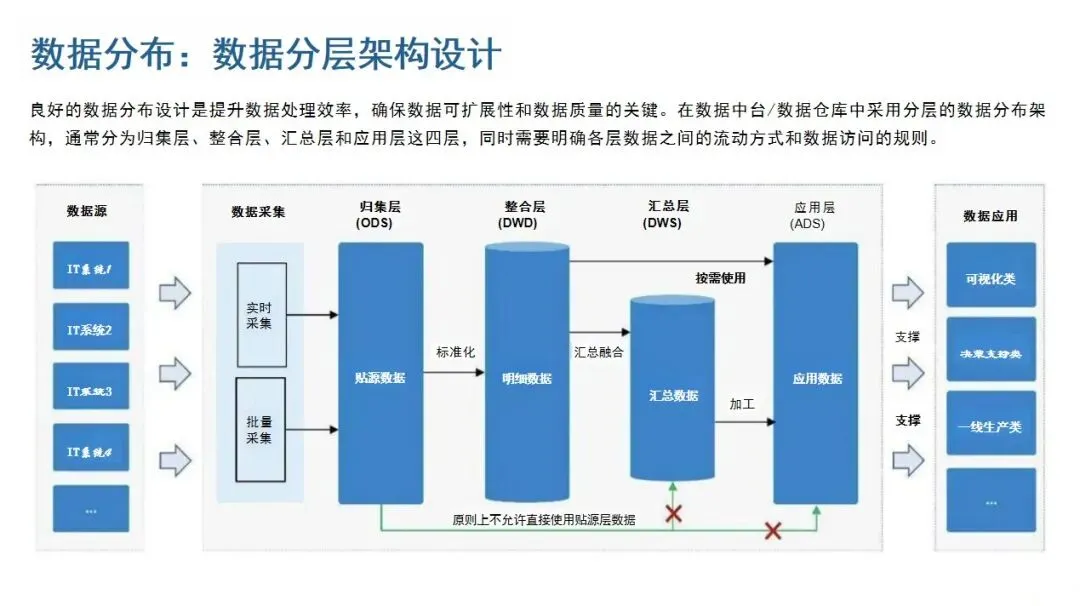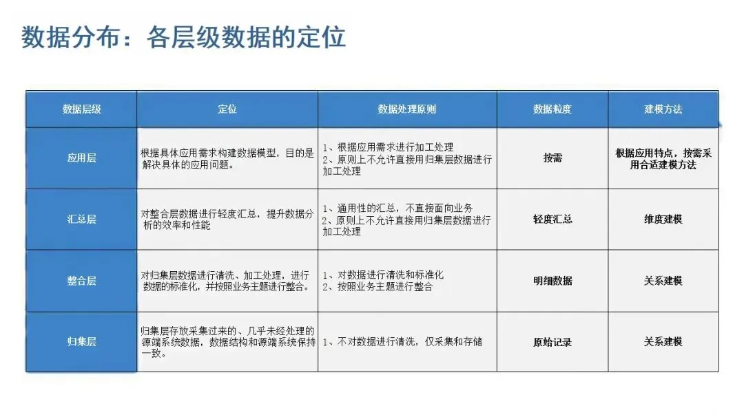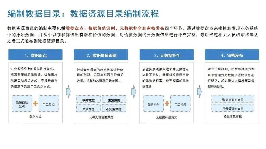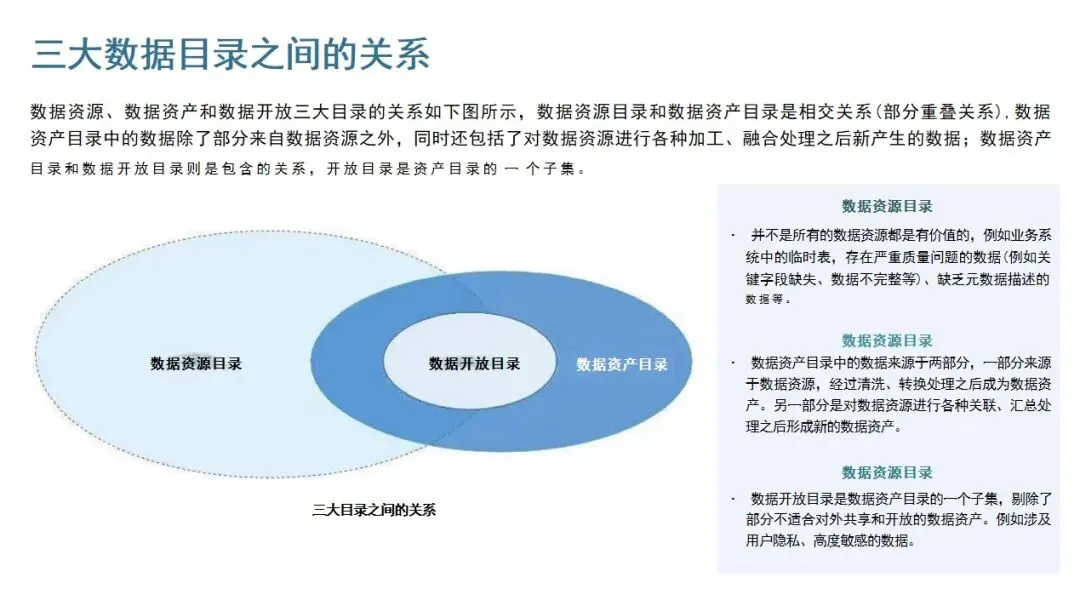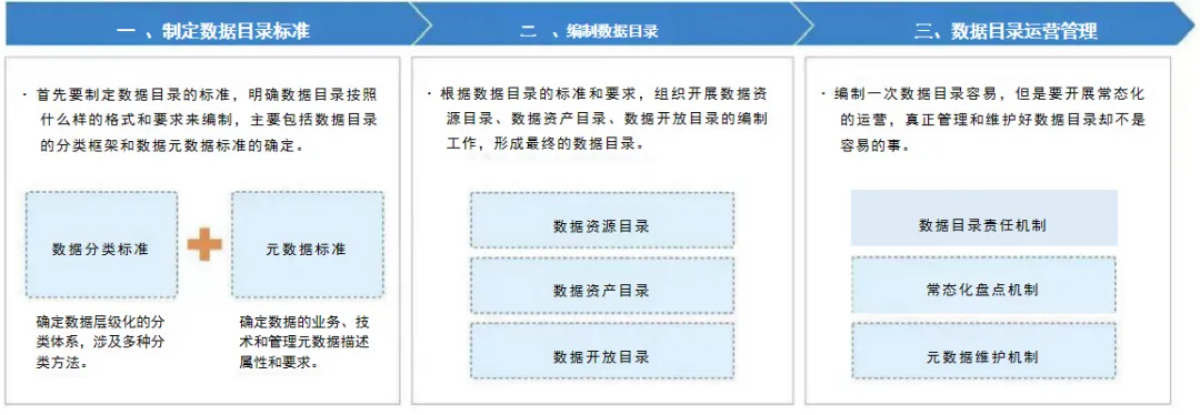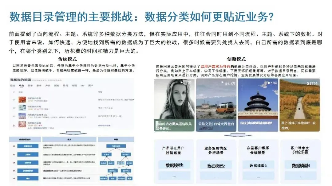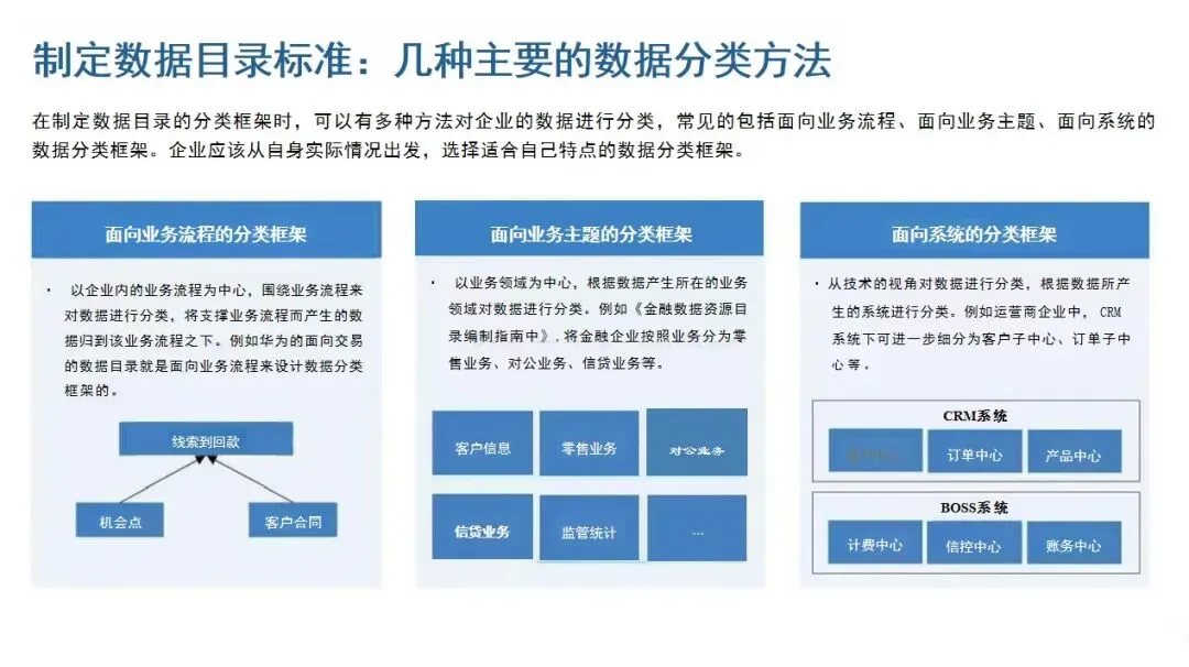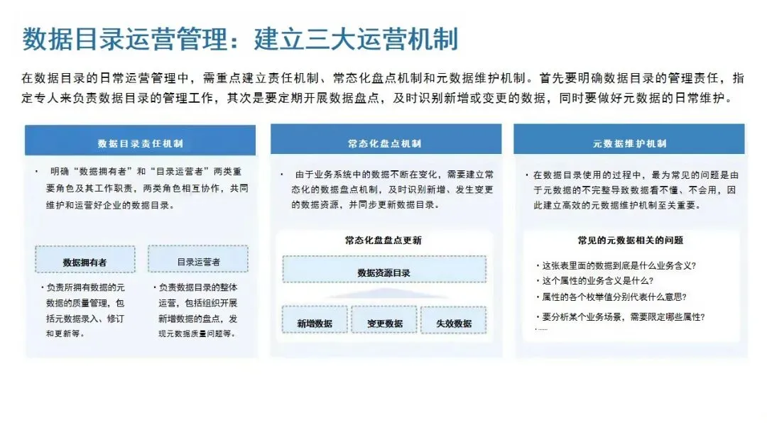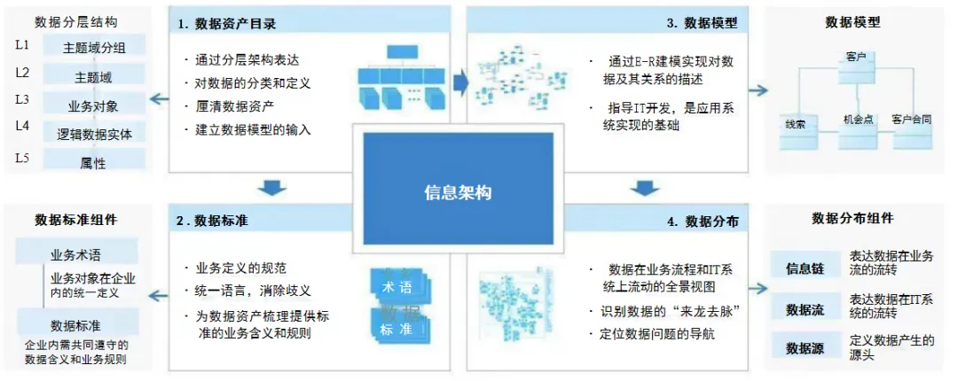 这四个目标分别由数据目录的四个核心部分来支持:作为“数据地图”的数据目录包含了资源目录、资产目录和开放目录,为用户提供了一个清晰的数据全景图;数据模型是对真实世界的一种抽象,分为三个层次:概念层、逻辑层和物理层,以适应不同的业务需要;数据规范是指企业内部统一的规范,其中包括对数据类型的命名和定义,以减少数据的模糊性;数据分布清晰地描述了各个系统中的数据分布和流程,层次化的架构有效地提升了处理效率。