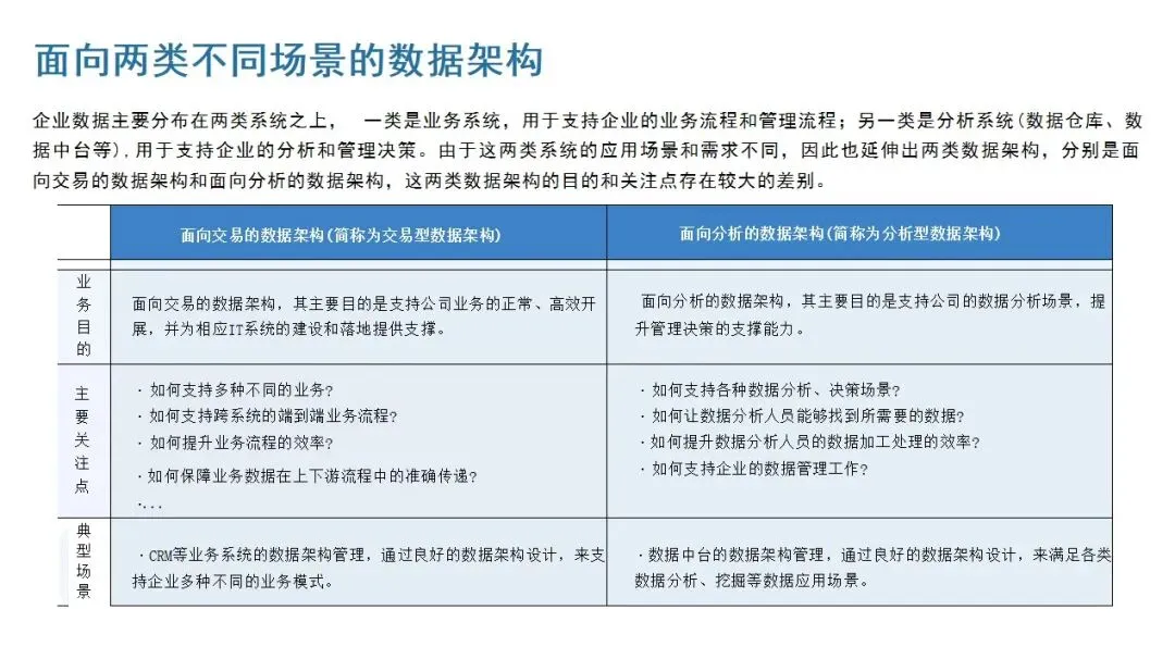 企业的数据分布在各种业务和分析系统之间,这相应于两种不同的数据架构:交易型架构集中在CRM和其他业务系统上,支持业务的高效运行和跨系统的流程,重点是业务的适应性、流程的效率和数据的准确性;面向分析的架构主要解决数据查询、数据处理效率、数据管理支持等方面的问题,服务于数据中台等需要数据分析和决策支持的场景。