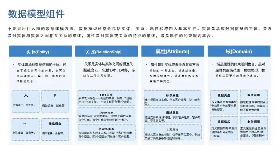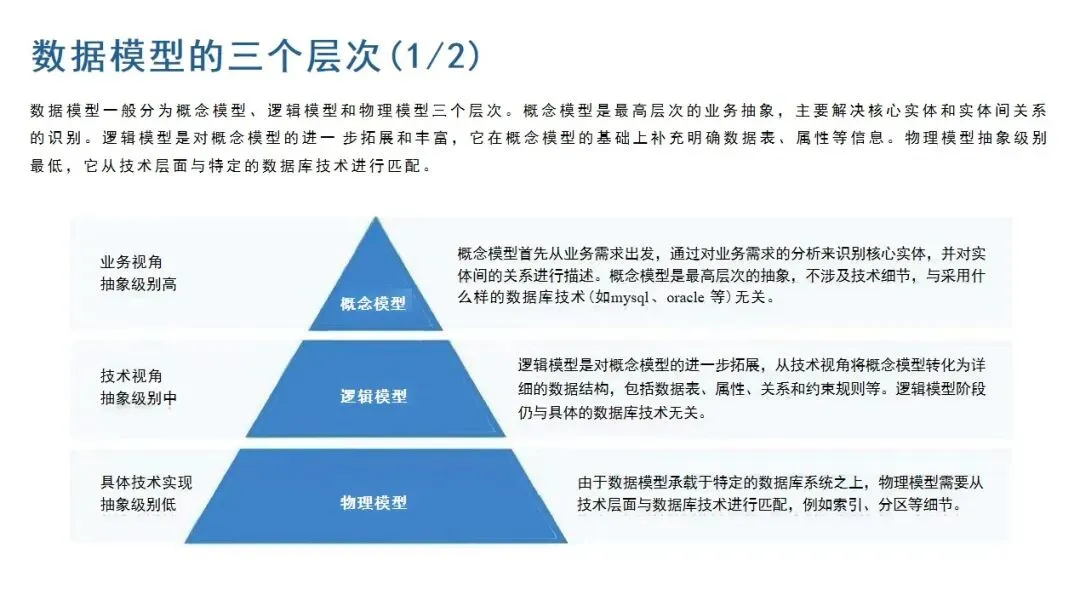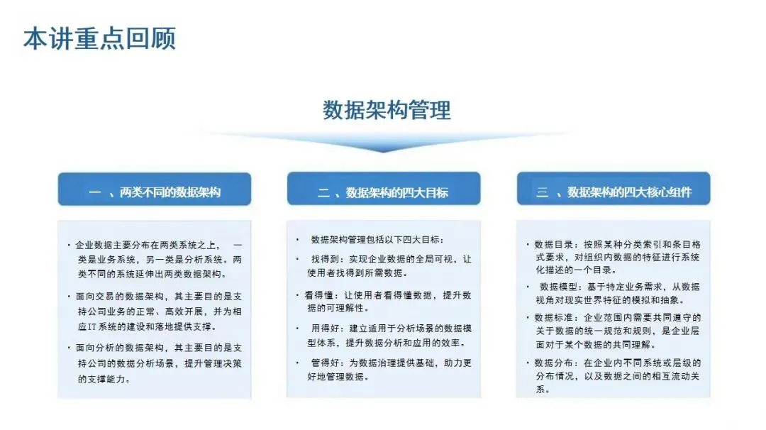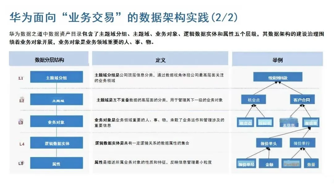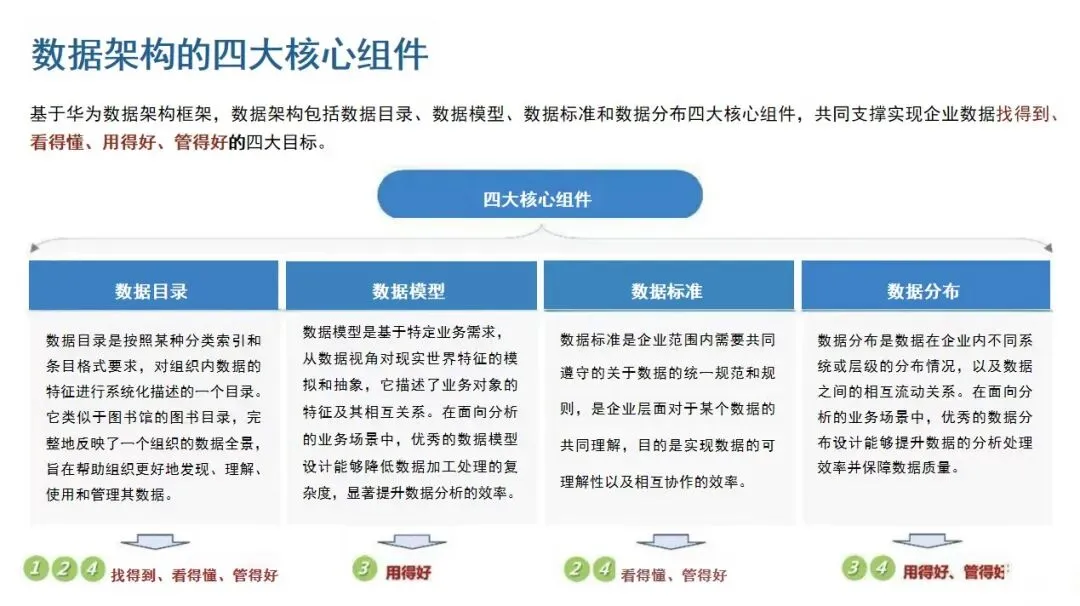 数据架构管理是企业实现数字化转型的重要支撑,其核心是对数据需求的准确识别和对数据总体蓝图的设计和维护,以此为指导进行数据集成,实现对数据资产的有效控制,保证数据投资和企业战略的同步。不同的组织从不同的角度对数据架构的理解是不一样的:DCMM强调以组织层次的数据模型来规范数据要求和元数据的管理;华为将业务实体转化为数据模型,将业务需求映射为信息服务功能;DAMA的重点是将数据需求和商业策略与总体蓝图相匹配。在实际应用时,不需要纠结于定义的优劣,与场景需求的匹配才是关键。