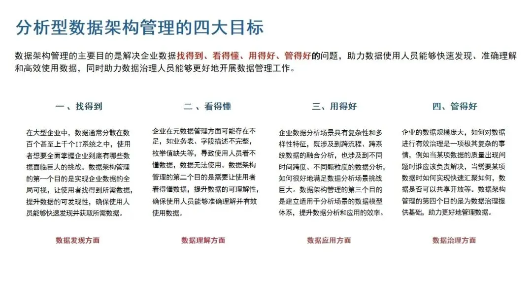 数据架构管理的主要目的在于解决“发现、理解、使用和管理”的四个关键问题:用户可以通过全局可视化的方式快速找到分布于多个系统中的数据;通过规范的描述,补齐元数据的不足之处,解决了业务表和字段描述的不完备性,使元数据更容易被用户理解;建立与分析方案相适应的模型系统,以满足跨过程、跨系统的复杂的数据分析需要;建立数据治理的基础设施,并对数据责任的划分、数据共享和开放的规则等关键管理环节进行了明确。