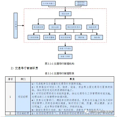1)为保障交通导行工作的顺利实施,确保施工期间的保通要求与交通安全,强化组织机构,加强畅通领导,成立以项目经理为组长,项目副经理、技术负责人、安全总监、商务经理为副组长,工程部和安全部具体负责实施、商务部及物资部全力配合、技术质量部提供技术支持的交通导行管理机构,加强保通组织管理。制定保通奖惩制度,逐级签订保通责任书,项目部定期检查、落实、兑现奖惩。交通导行管理机构见图3.1-1。