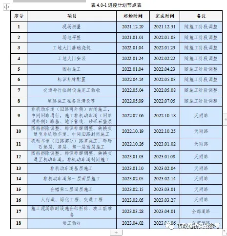具体进度计划详见图4.0-1 魏县新区核心路网项目交通导行施工进度计划,具体开工日期以建设单位场地征迁完成,具备进场施工条件时,监理单位的开工令为准。见下表4.0-1 进度计划节点表。
