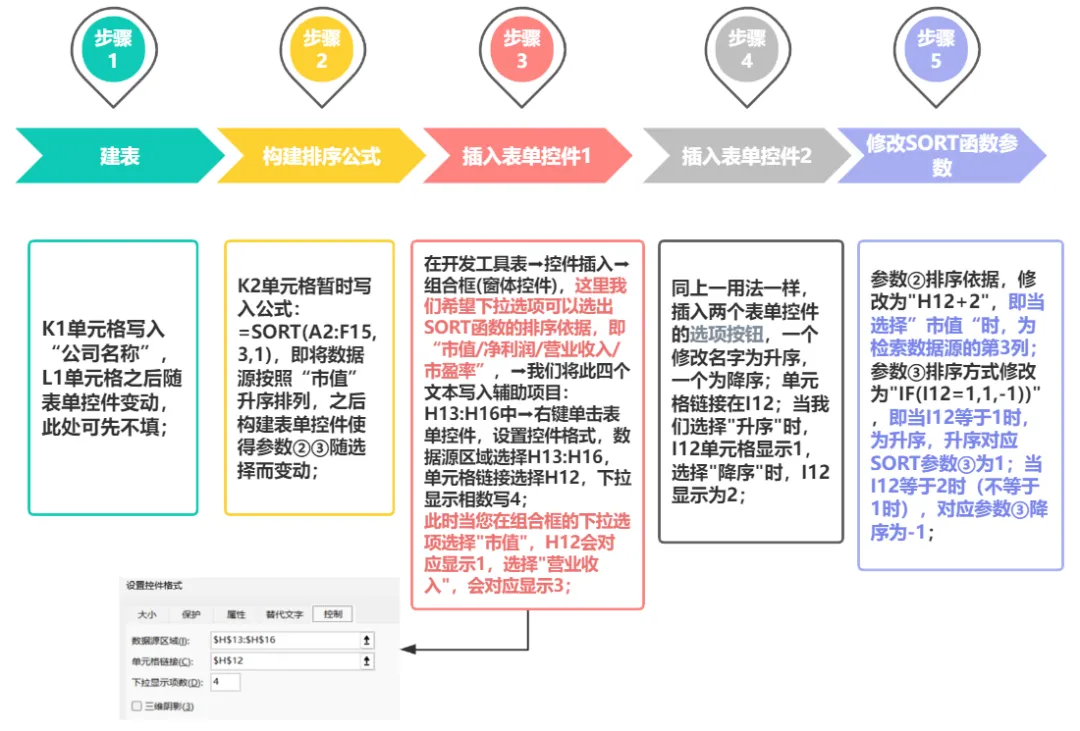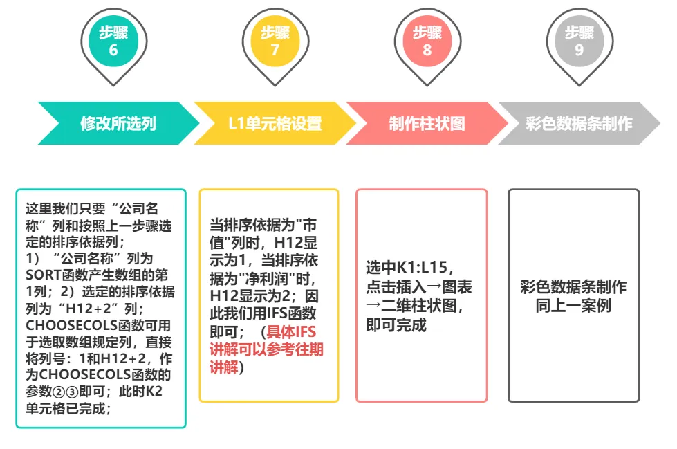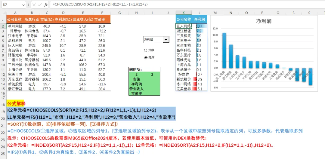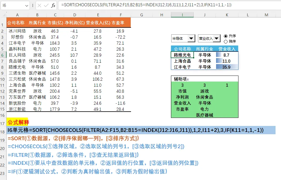 此案例较前一案例增加了“所属行业”,需要使用【FILTER】函数,参数②—筛选条件为B列中属于通过表单控件选择的行业。这里大家可依据此前案例,自行构建表单控件和理解公式,完成后可与模板中做对比,在这边不做赘述了,如果有任何问题可私信沟通。对【FILTER】函数的详细介绍可以参考往期FILTER函数“用法7——返回指定列”。