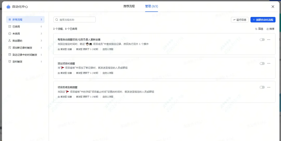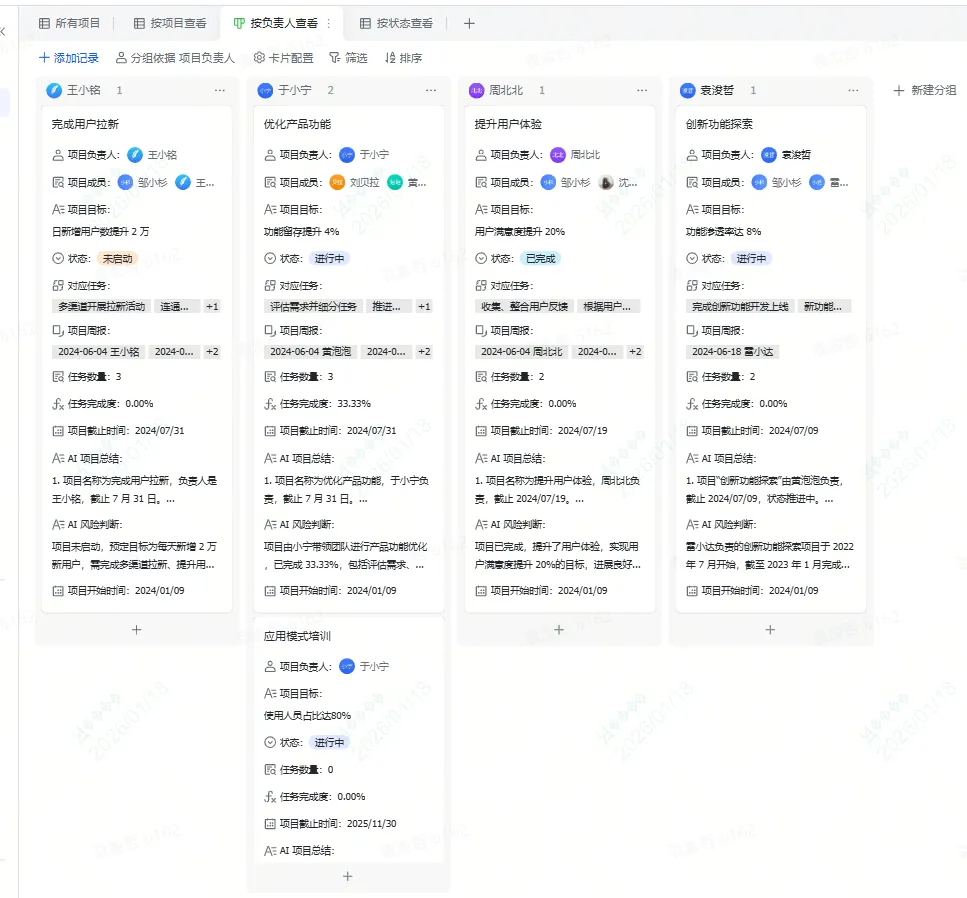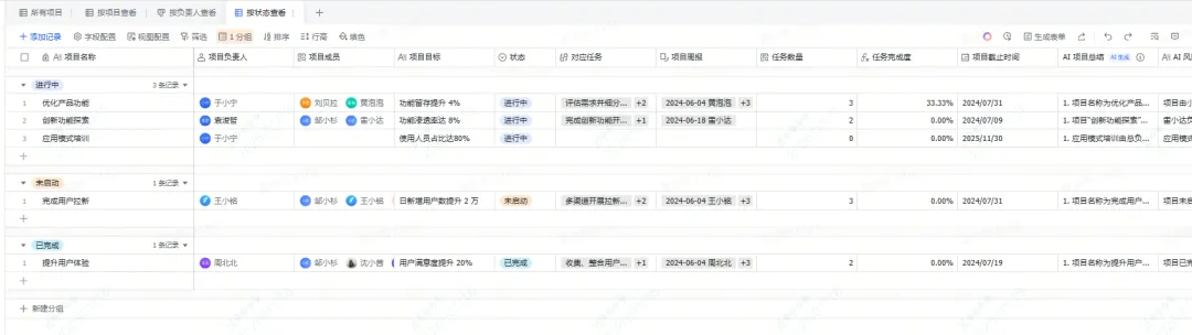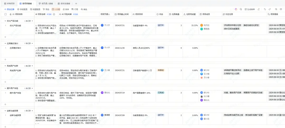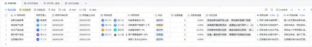 AI 项目总结 | AI 字段 | 配置 Prompt:"请根据以下信息,总结该项目的当前进展:项目目标:{项目目标},任务完成度:{任务完成度},相关周报:{项目周报}"。AI 会自动读取这些字段,一键生成一段结构化的阶段性汇报。 |