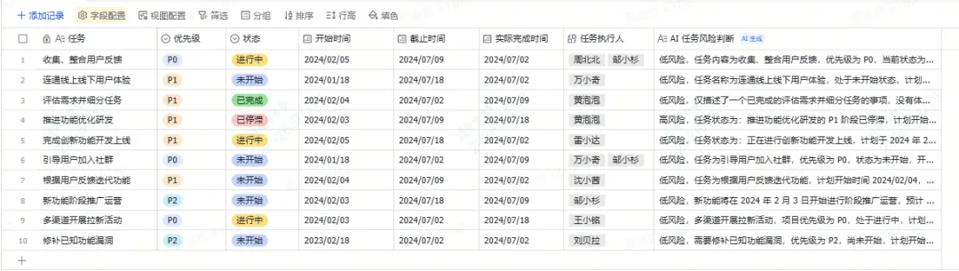 AI 任务风险判断 | AI 字段 | 配置 Prompt:"任务 {任务} 的截止时间是 {截止时间},优先级是 {优先级},当前状态是 {状态}。请判断该任务是否存在延期风险。 |