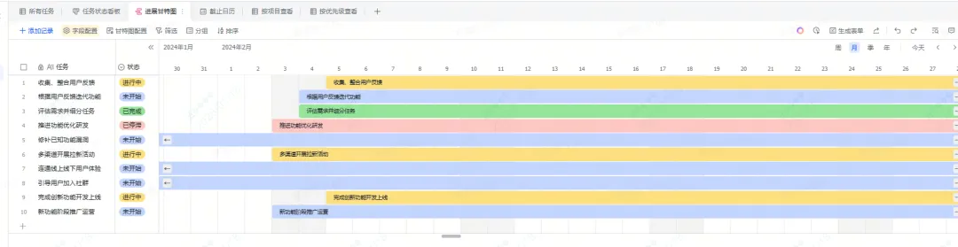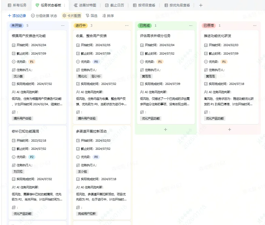状态 | 单选 | 选项:待开始、进行中、已完成、已阻塞。 |