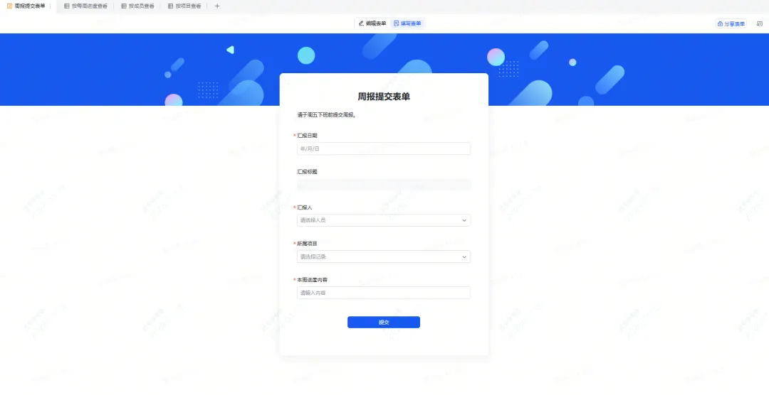 进度内容 | 多行文本 | 填写本周完成的事项、遇到的问题、下周计划。 |