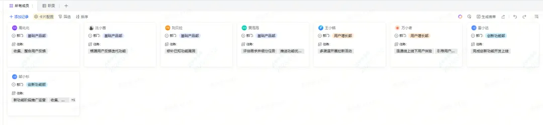 任务 | 双向关联 | 从"项目任务表"中选择。点开一个成员,就能看到他身上背的所有任务。 |