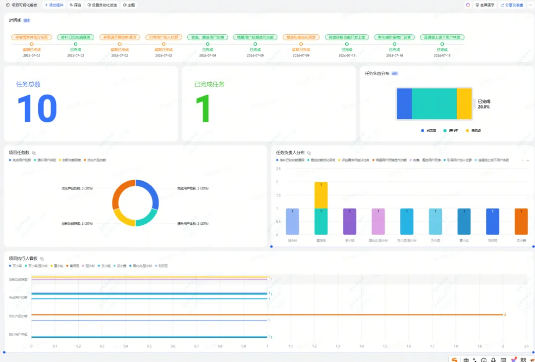 项目状态 | 单选 | 选项:未启动、进行中、已完成。管理项目进度,同时用于仪表盘的状态分布统计。 |