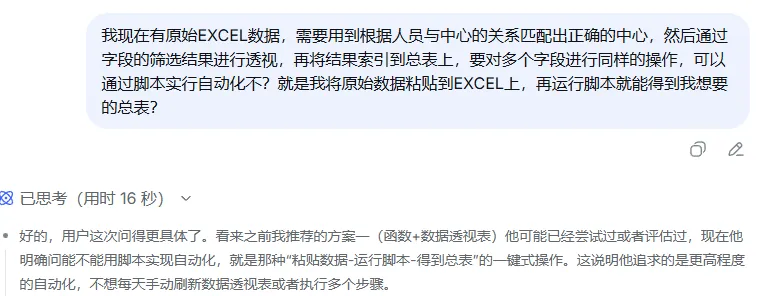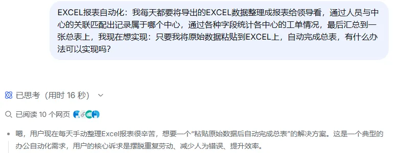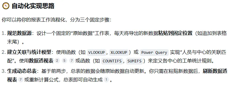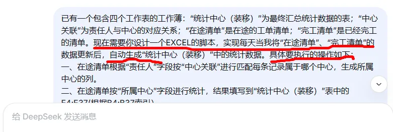 在这以前,我每天都要被报表折磨得死去活来的,每天领导都要看两个日报,一个装移机的,一个故障的,重重复复的复制、粘贴、透视、索引、函数公式等等,做完得两三个小时,手指按肿了,眼睛看花了,腰间盘突出了,真是苦不堪言。“但你知道吗?现在我只需要点几下,就全搞定。不过,这条捷径我摸索了整整两天。”“这就是最终的成果,只要将系统导出的原始数据粘贴到指定的工作表,需要的报表,点几下完成。”由于第1步问的答案不是我想要的,继续问deepseek: